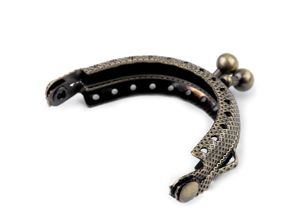 Kovový vintage rámeček je vhodný na výrobu mini peněženky. Rámeček je určený k našití, kdy se látka dovnitř vloží a ručně přešije přes dírky, jejichž rozpětí je 5 mm. Dírky jsou jen na vnější straně rámečku, která je delší než vnitřní, tudíž je našívání jednodušší. Vnitřní rozměry rozvoru jsou 4,2 x 5,2 cm. Vnější rozměry rozvoru jsou 5,5 x 6 cm. Výška zavřeného rámečku je 3,5 cm (včetně zapínání 4,3 cm).- Zavřený rámeček: 5,5 x 4,3 cm