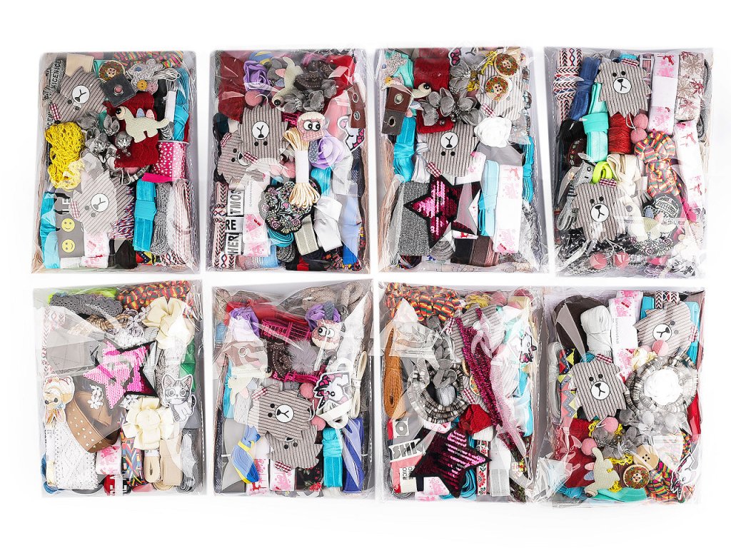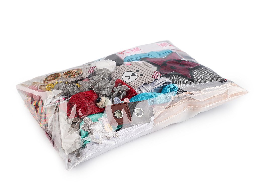 Mix různých materiálů je vhodný na kreativní tvoření a šití. Najdete zde například stuhy, pruženky, prýmky, třásně, nažehlovačky, knoflíky a různé aplikace. Barvy, délky, šíře a druhy materiálů mohou lišit. Foto pouze ilustrační.- Hmotnost: 500 g