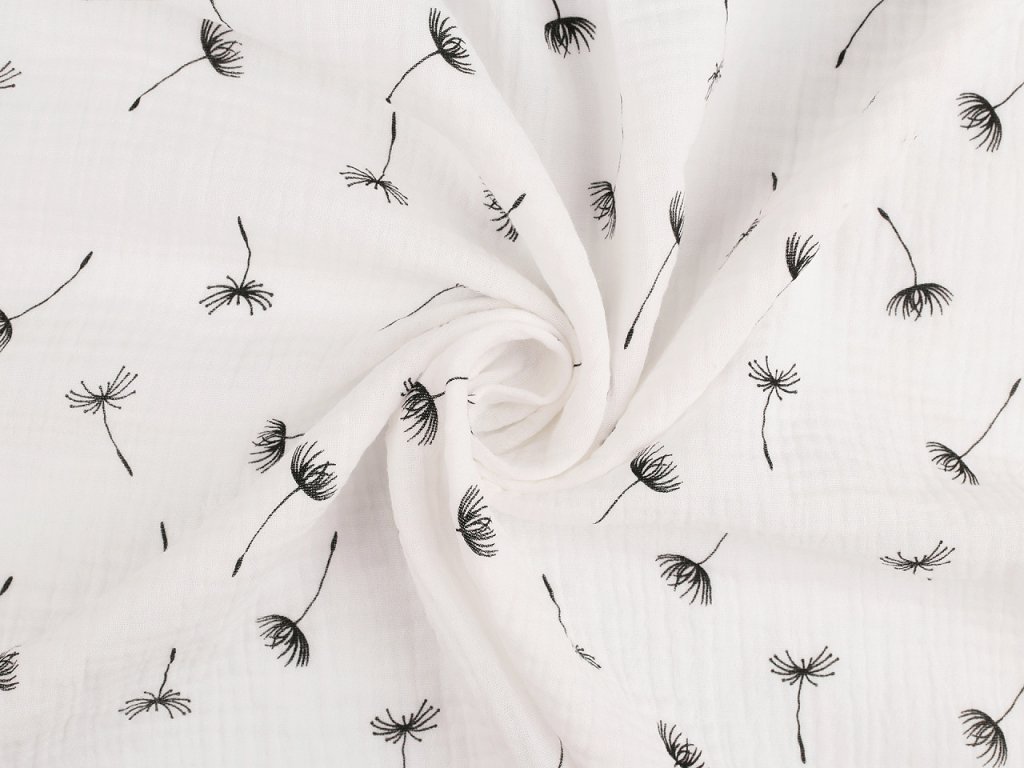 Bavlněný mušelín zdobí potisk jemného pampeliškového chmýří. Je lehký, prodyšný a neprůsvitný, tkaný ze speciálně vyhlazených vláken. Vyniká dostatečnou pevností a odolností, je ze dvou vrstev spojených neviditelnými stehy. Pokožka si ho zamiluje hlavně v letních měsících. Velkou výhodou je, že se nemusí žehlit. Mušelín je oblíbený na dětské výrobky, dečky, osušky i lehké letní šaty, sukně, tuniky, šátky apod.- Gramáž: 115 - 125 g/m²