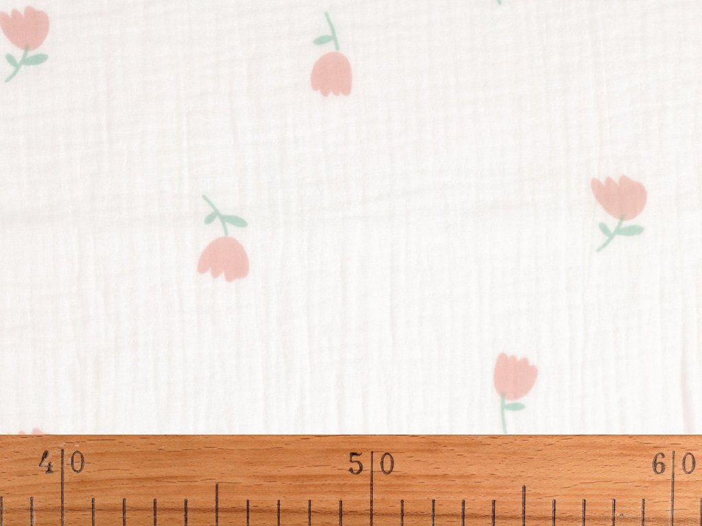 Mušelín zdobí potisk tulipánů. Je lehký, prodyšný a neprůsvitný, tkaný ze speciálně vyhlazených vláken. Zároveň vyniká dostatečnou pevností. Pokožka si ho zamiluje hlavně v letních měsících. Velkou výhodou je, že se nemusí žehlit. Mušelín je oblíbený na dětské výrobky, dečky, osušky i lehké letní šaty, sukně, tuniky, šátky apod. Po celé délce okraje je cca 6 cm široký zašpiněný pruh. Tento mušelín není dvojitý.- Gramáž: 115 - 125 g/m²