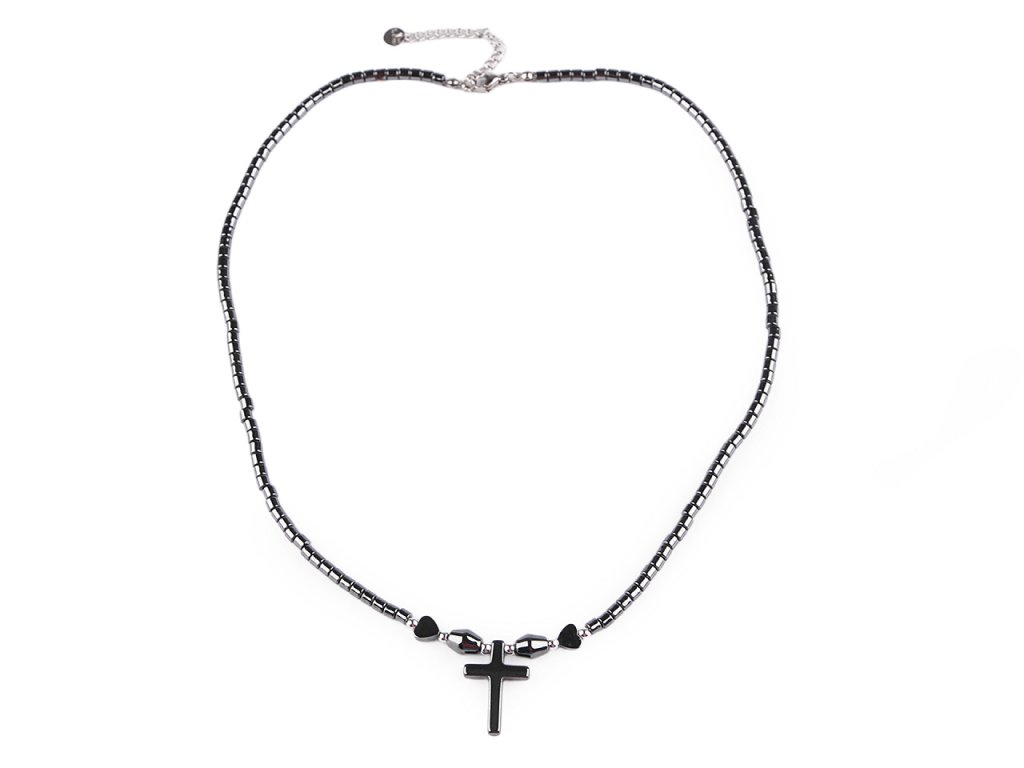 Poutavý náhrdelník vyrobený z korálků pokoveného hematitu a kvalitní nerezové oceli patří mezi šperky, které zaujmou na první pohled. Uprostřed je ozdobený výrazným přívěskem. Díky své univerzálnosti snadno doplní jakýkoliv outfit. Zapíná se na karabinku a prodlužovací řetízek.- Délka: 48 cm