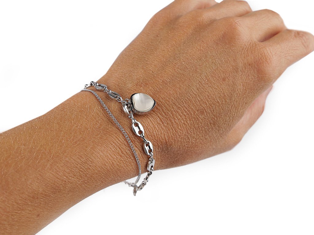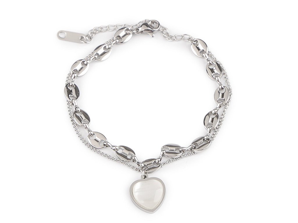 Dvojitý náramek s přívěskem srdce má kvalitní zpracování z nerezové oceli. Srdce je ozdobené poutavou imitací perleti. Náramek má provedení ve vysokém lesku, dá se nosit jako doplněk k jakémukoliv oděvu. Potěší srdce každé ženy, bude perfektním dárkem na Valentýna. Zapíná se na karabinku a prodlužovací řetízek.- Délka: 17 cm