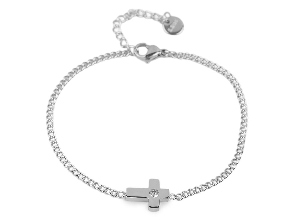 Náramek z nerezové oceli má poutavý detail v podobě křížku s broušeným kamínkem. Jednoduchý design z něj činí dokonalý módní doplněk pro každodenní nošení. Díky zapínání na karabinku a adjustačnímu řetízku je náramek snadno nastavitelný a dokonale se přizpůsobí vašemu zápěstí. Rozměry křížku jsou 9 x 12 mm.- Délka: 16,5 cm