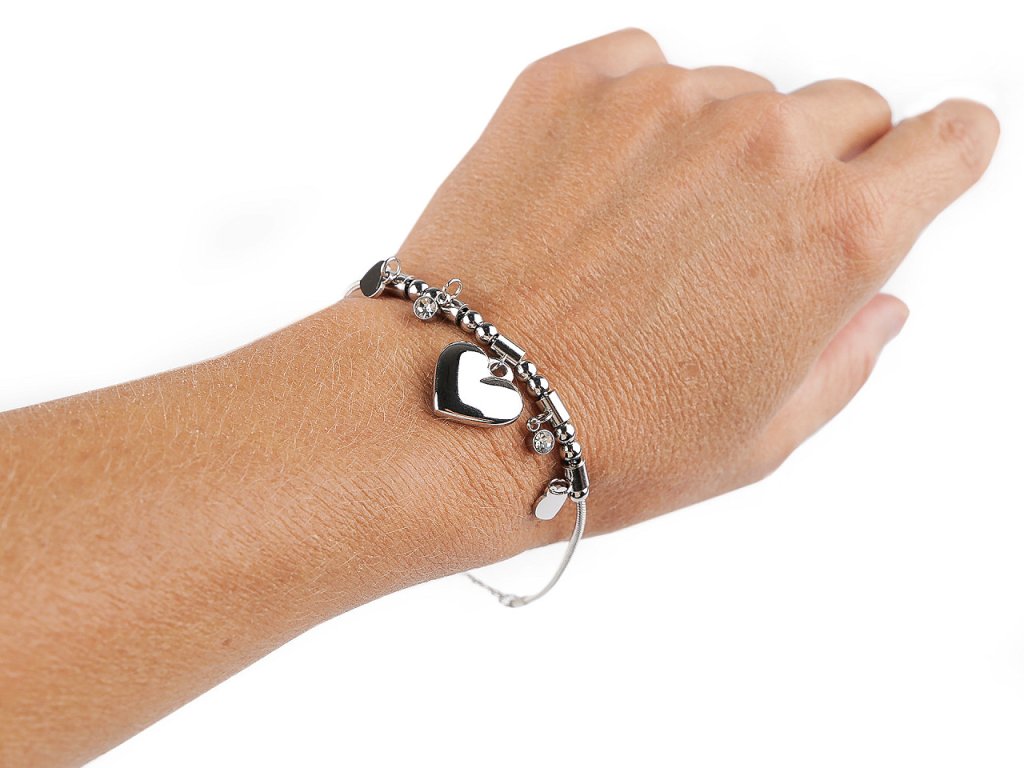 Hadí náramek z nerezové oceli má ve středu výraznou ozdobu z korálků, přívěsků a broušených kamínků. Na zápěstí nejvíc upoutá přívěsek s velkým srdcem. Náramek má provedení ve vysokém lesku. Má kvalitní zpracování, poutavě dozdobí vaše zápěstí. Je perfektní pro nošení jak na každodenní příležitosti, tak i na zvláštní události. Zapíná se na karabinku a prodlužovací řetízek.- Délka: 18 cm