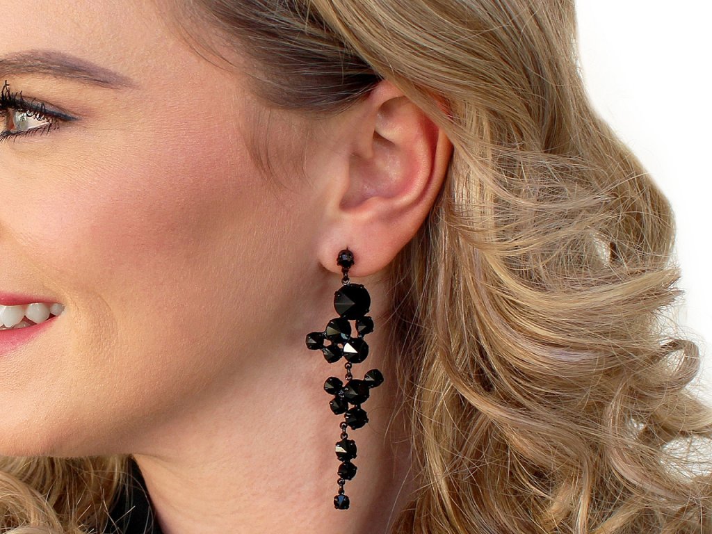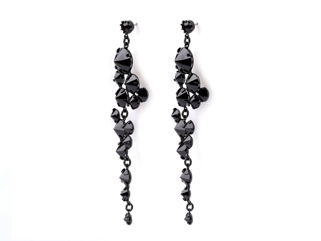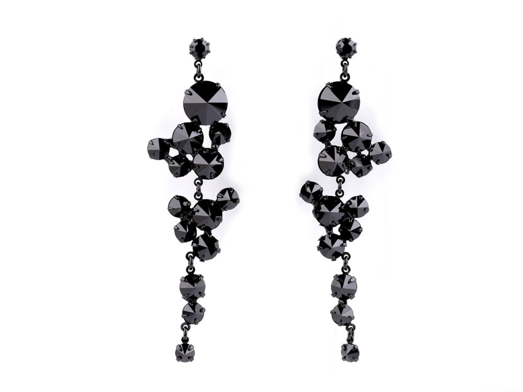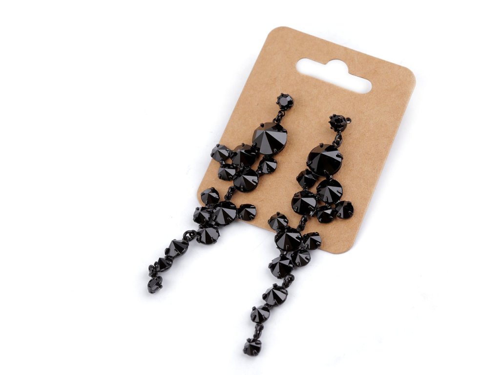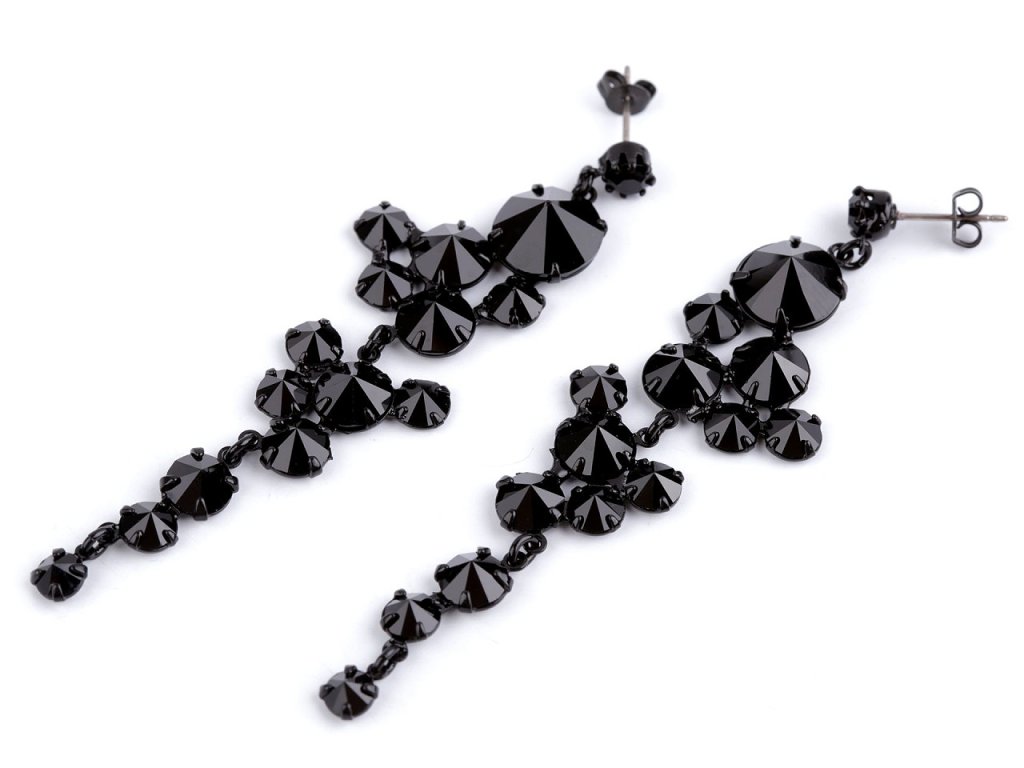 Dlouhé elegantní náušnice ozdobené broušenými kamínky jsou velice výrazné. Jsou nepřehlédnutelné, hodí se na speciální příležitosti. Skleněné broušené kamínky prvotřídní české kvality jsou pevně zasazené do kovového lůžka. Na slunci i umělém světle se náušnice zajímavě třpytí. Náušnice jsou puzetového typu s kovovou zarážkou.- Šířka: 20 mm