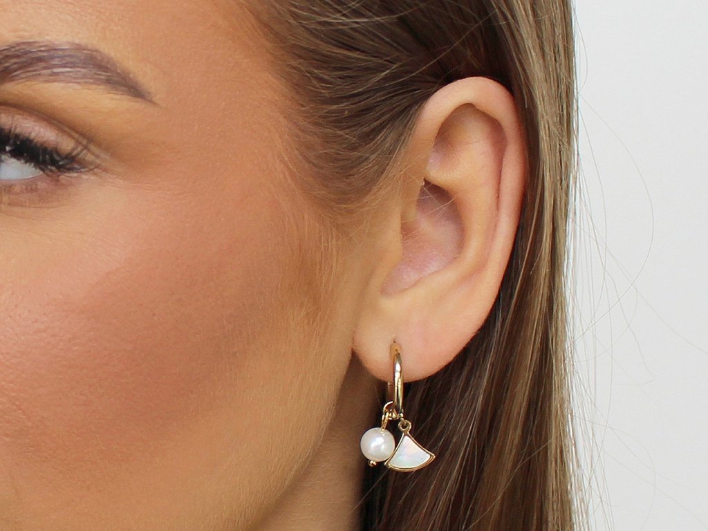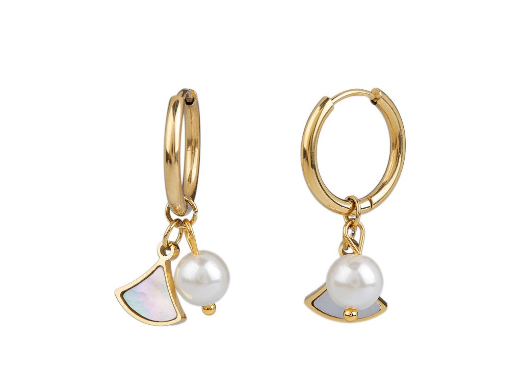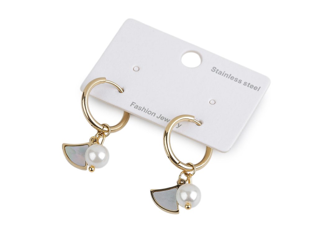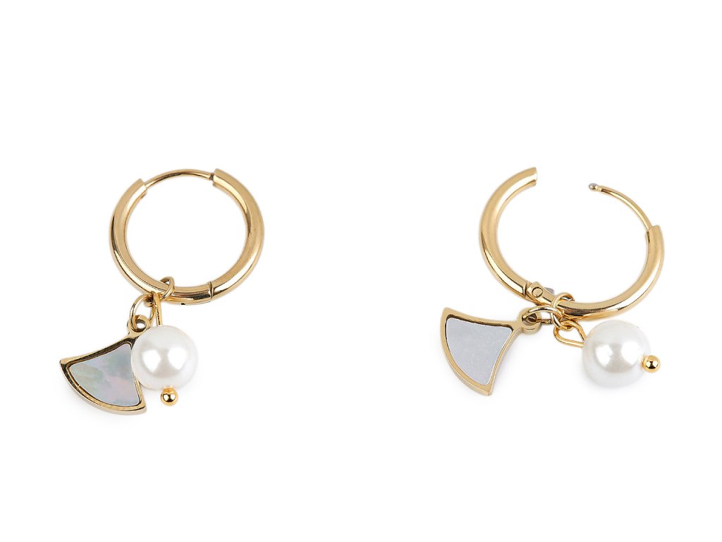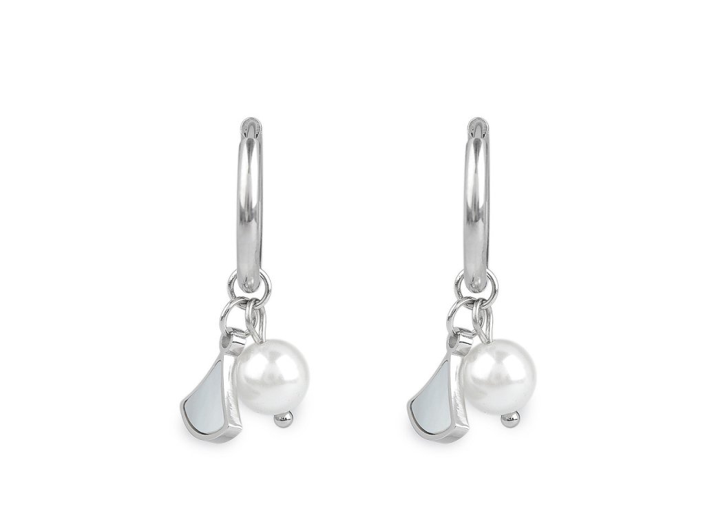 Náušnice kroužky jsou vyrobené z kvalitní nerezové oceli. Dole jsou ozdobené přívěskem perly a lístku s vsazenou imitací perleti. Jsou velice elegantní, oceníte je ke každodennímu nošení, ale i ke slavnostním příležitostem. Skvěle doplní byznys styl oblékání, ležérní outfity i společenské šaty. Dají se rozevřít, zapínají se zacvaknutím. Přívěsky lze z kroužku sundat a nosit ho jen samotný, neozdobený.- Průměr: 16 mm