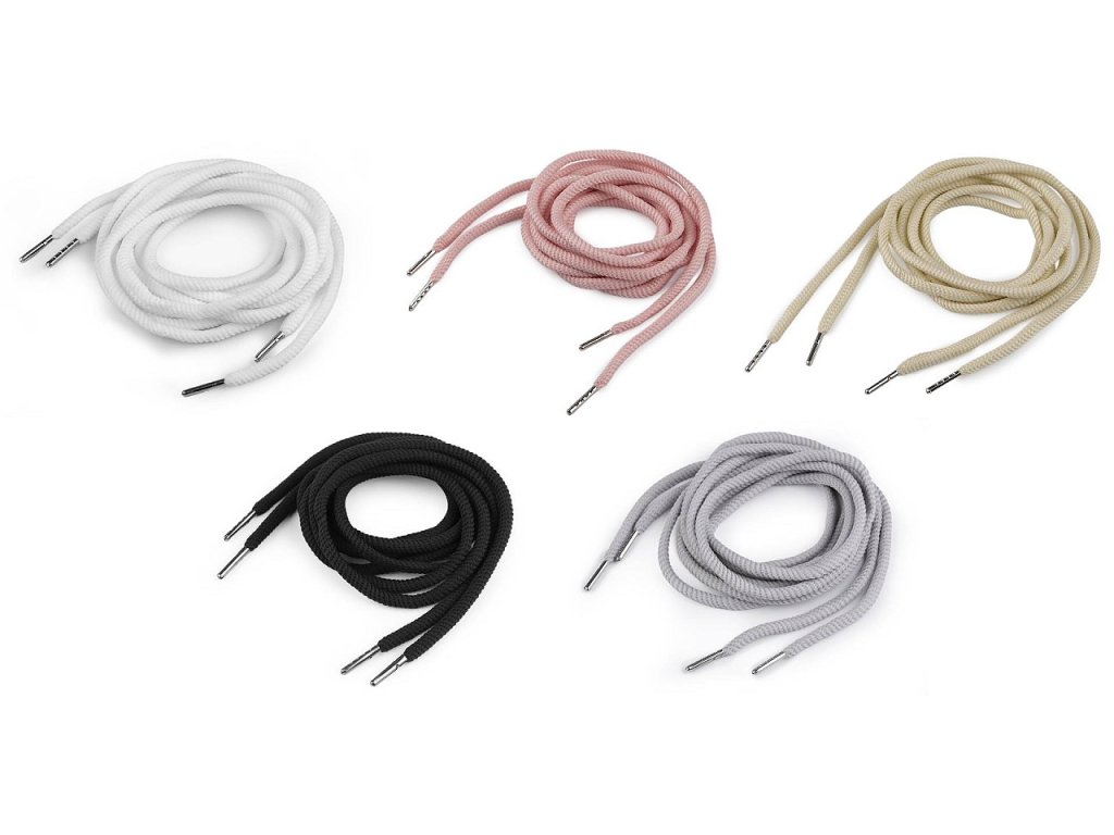 Kulatá oděvní šňůrka vám usnadní práci, protože je již opatřena kovovými koncovkami. Použití: Kulatá šňůrka je vhodná do tunýlků bund, mikin, tepláků a jiných oděvů. Struktura povrchu je u obou variant odlišná. Bílá šňůrka má úplet, který působí jako kroucený, černá šňůrka má klasický jemný úplet, viz. foto.- Průměr: 5 mm