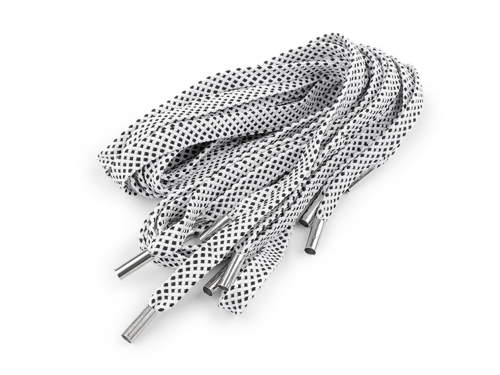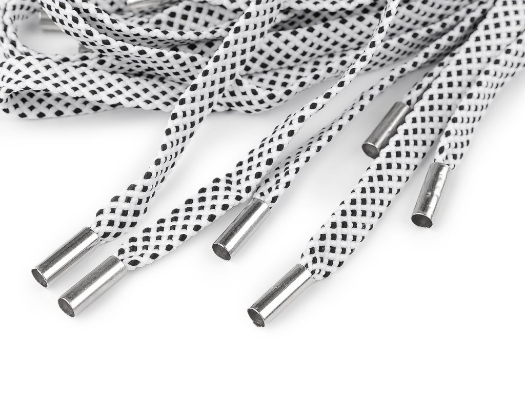 Pevná oděvní šňůra je plochá, s károvaným vzorem. Na obou stranách má kovovou koncovku. Délka koncovek je 1,8 cm.