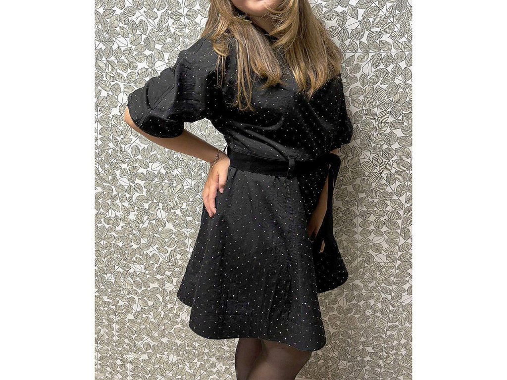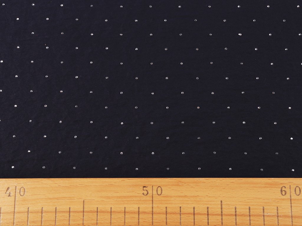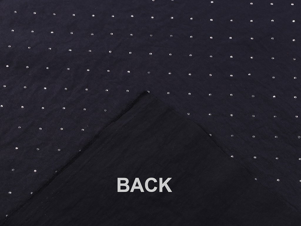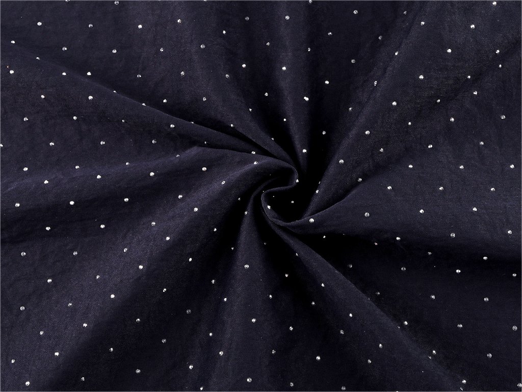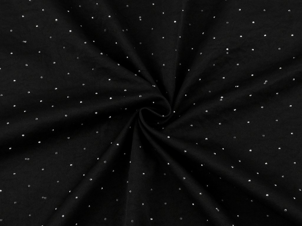 Látka s broušenými kamínky pruží diagonálně a lehce po šíři. Můžete z ní ušít saka, kalhoty, šaty, vesty i bomber bundy. Kamínky na látce se jemně třpytí a upoutají na první pohled.- Gramáž: 180 g/m²