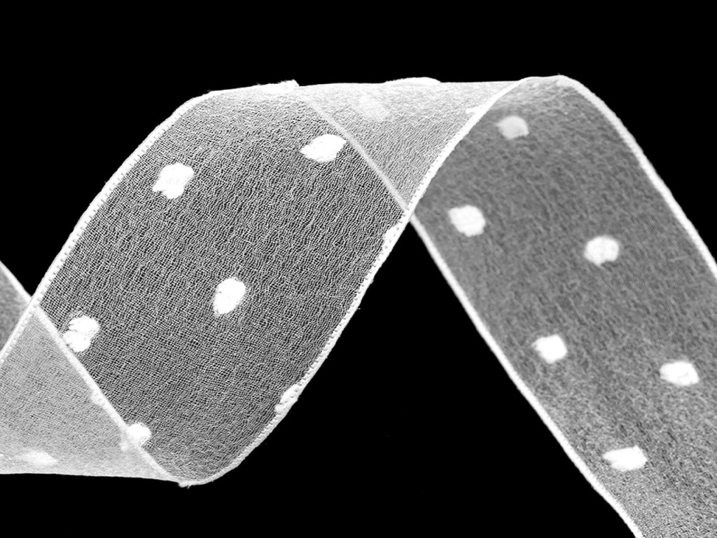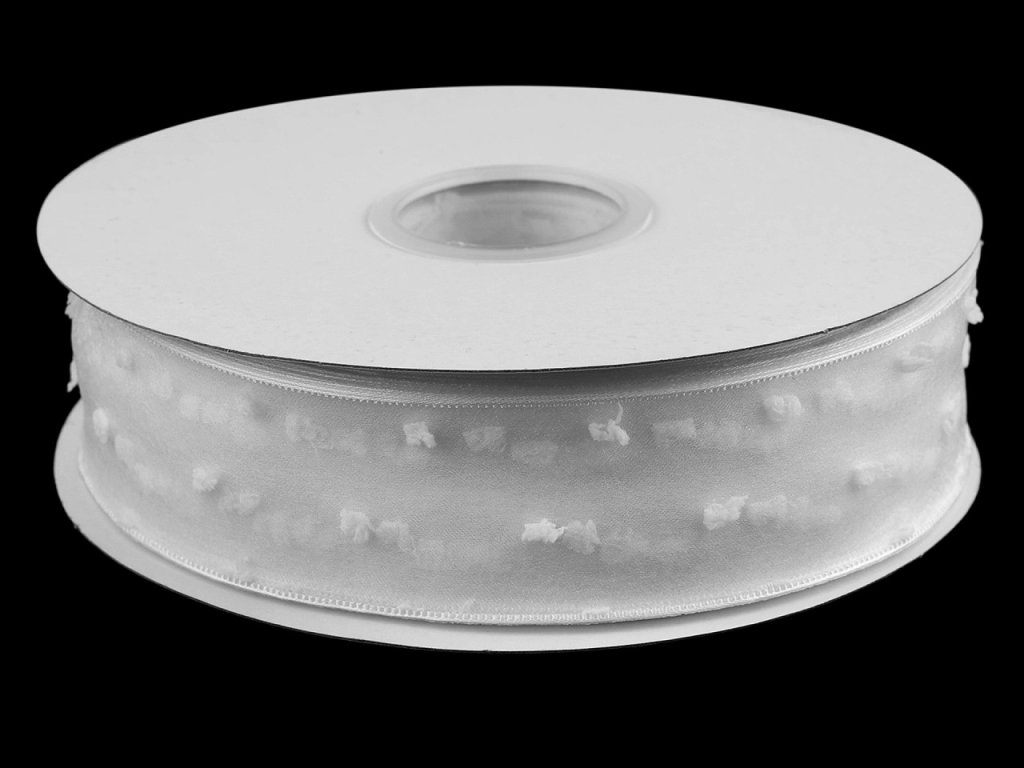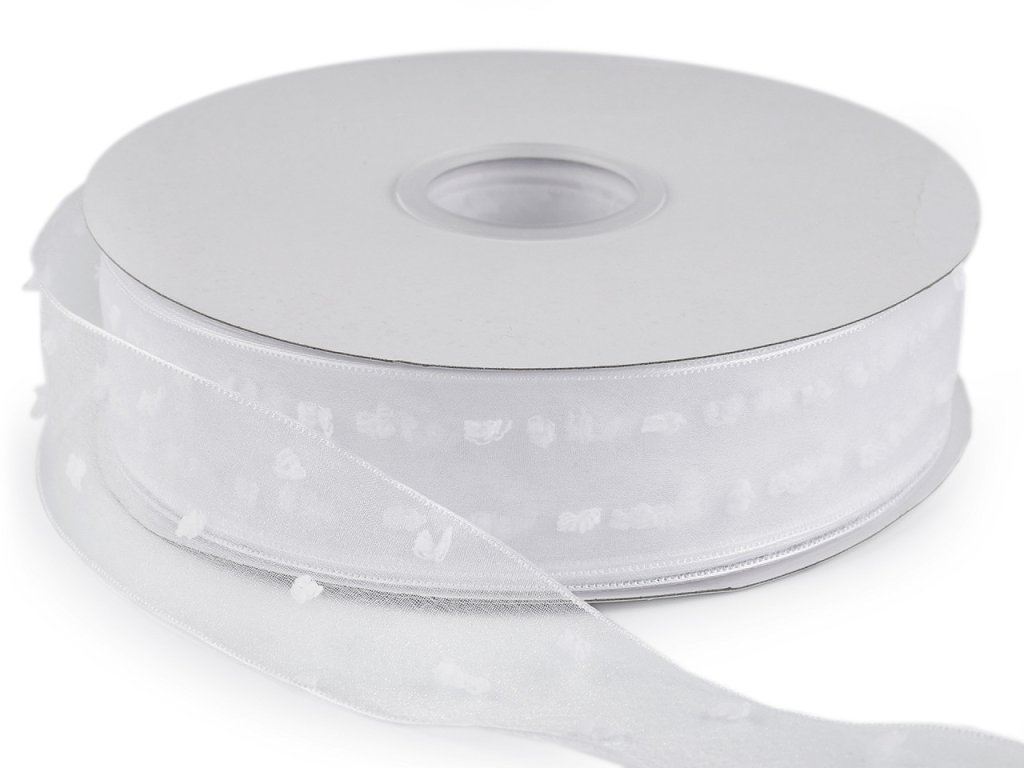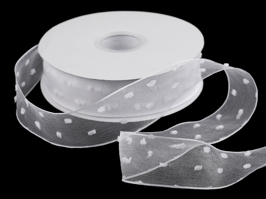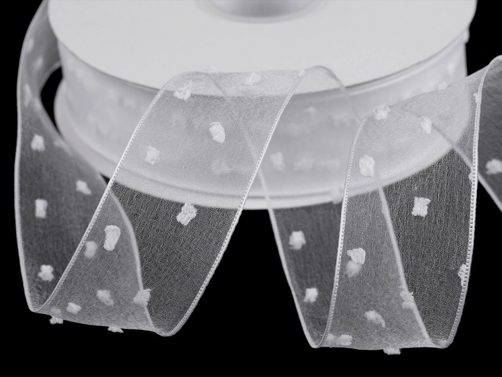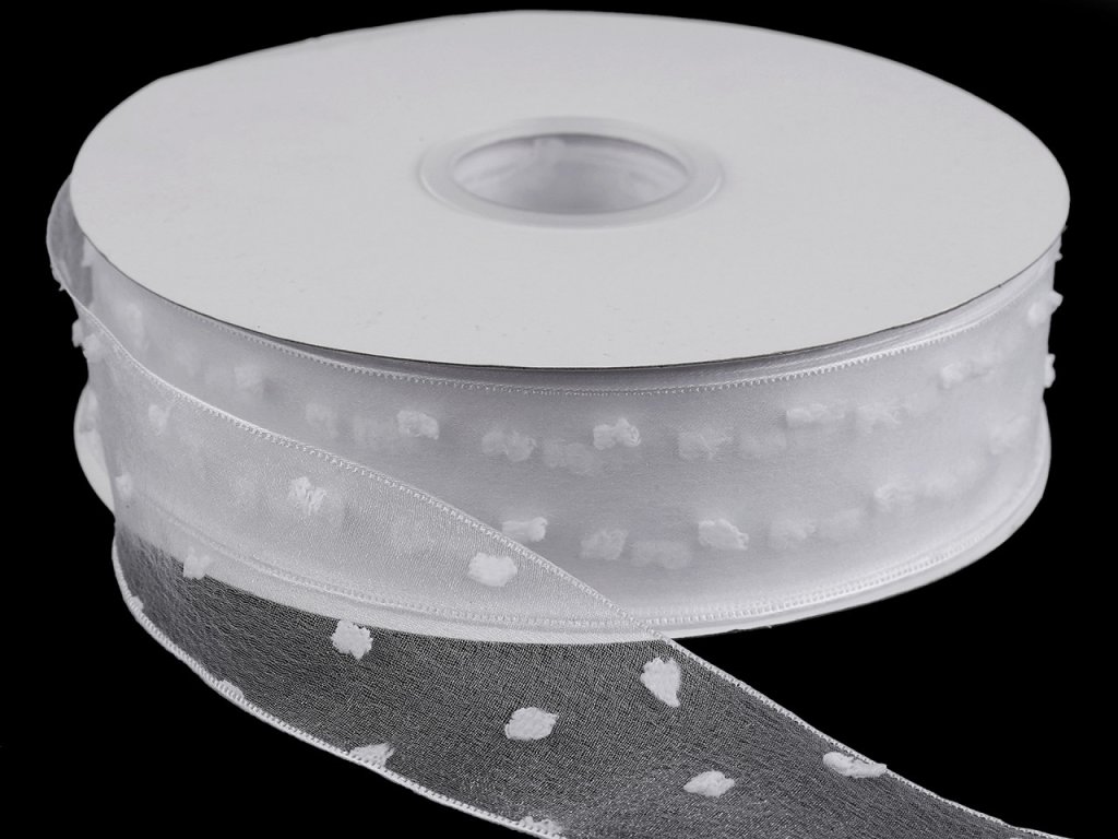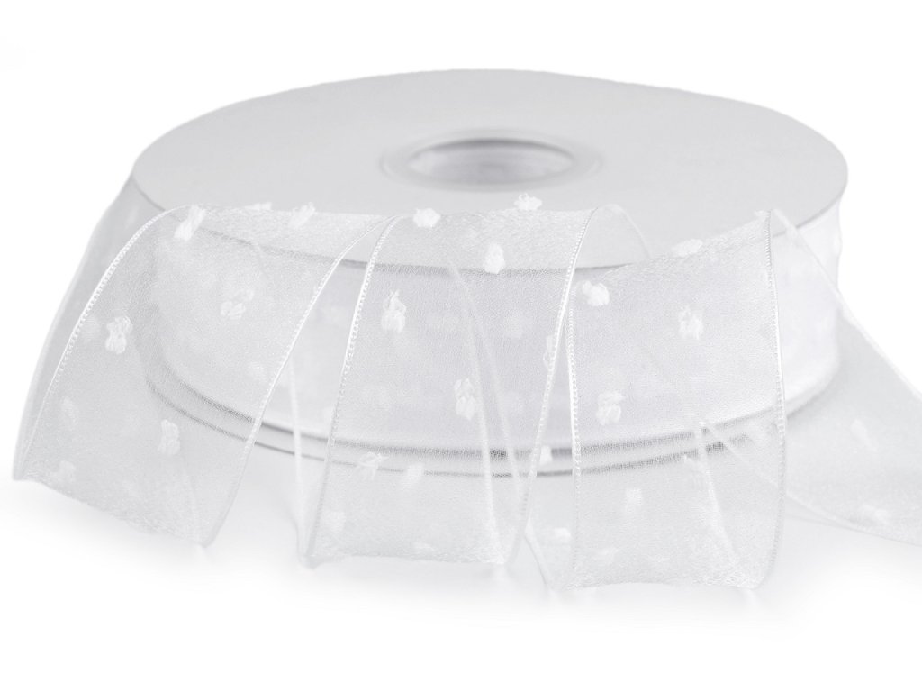 Organzová stuha s nopky vypadá velice elegantně. Je jemná, ale pěkně drží tvar. Po stranách je zpevněná. Použití: Stuhu využijete při různých slavnostních příležitostech (například na svatbě) jako dekoraci na židle, stoly, auta, manžety květin apod. Můžete z ní vyrobit i jednoduché mašle. Je vhodná také k šití nebo lemování.- Šíře: 40 mm