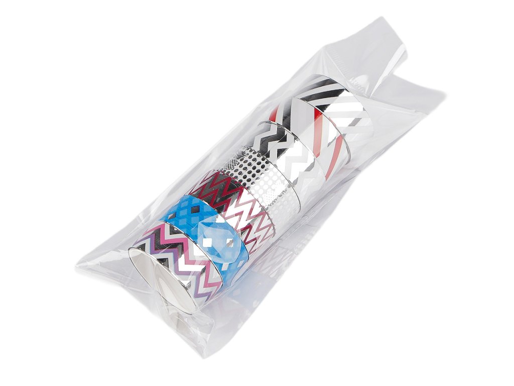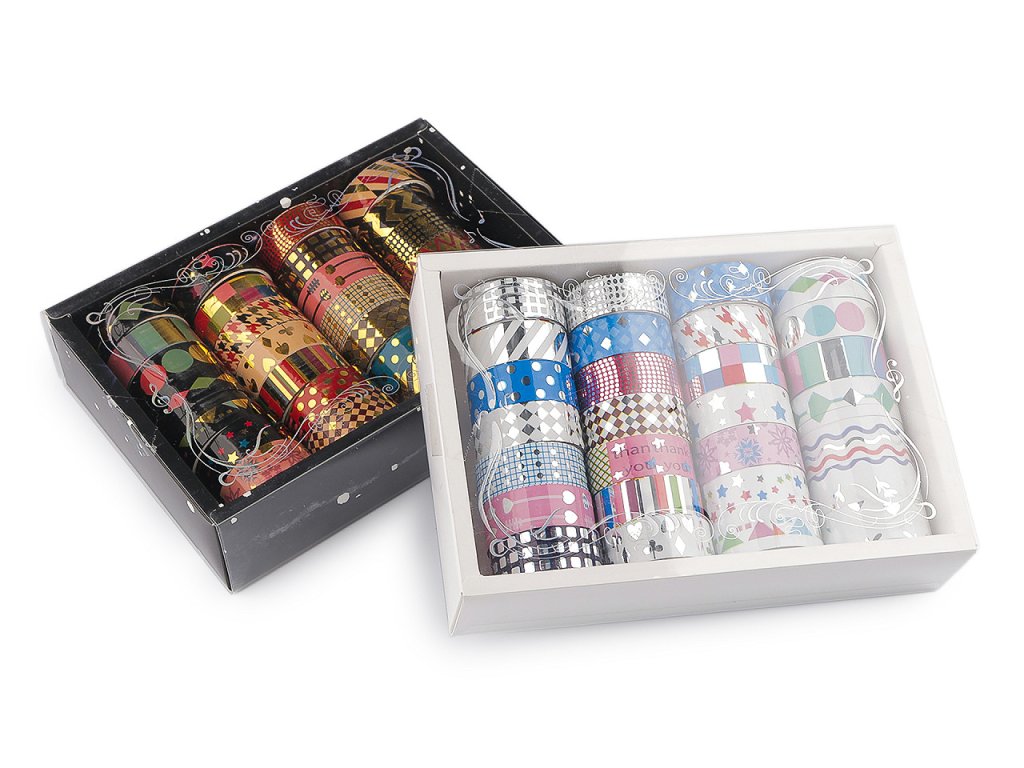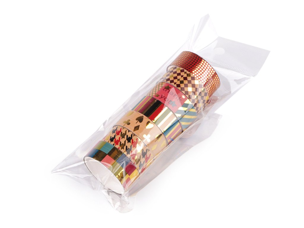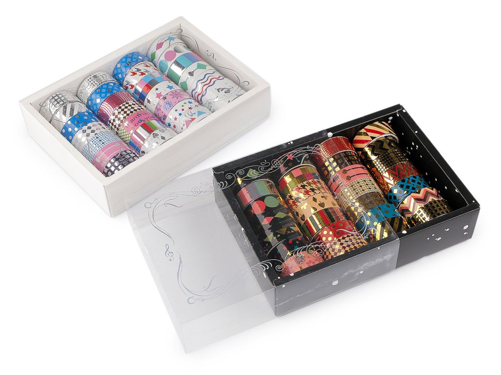 Sada lepicích pásek, které jsou ozdobené lesklými metalickými detaily. Využijete je na všech hladkých materiálech, jako je dřevo, plast, papír, sklo, atd. Můžete s nimi ozdobit dárky a krabičky či je nalepit na přáníčka, alba, fotorámečky, do diáře apod. Díky samolepicí vrstvě je velmi snadno použitelná, je pevná, nedá se trhat. Sada obsahuje 7 ks pásek s různým designem. Každý kotouček obsahuje cca 1,7 m pásky. Velké balení 24 ks pásek je zabalené v papírové krabičce s transparentním víkem. Krabička má rozměry 12 x 16,5 x 4 cm.- Šířka: 15 mm