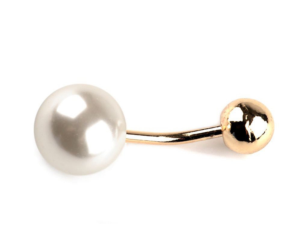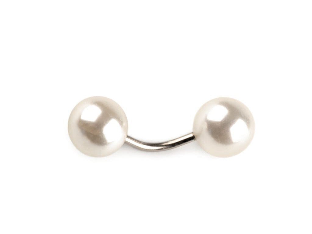 Elegantní brož s perlami můžete používat jako klasickou brož k ozdobení oděvů, ale dá se využít i jako designové zapínání. Lesklé perly dodají půvab vašim oděvům i módním doplňkům. Skvěle ozdobí např. svetřík, tašku, čepici, klobouk, boty apod. Jeden konec je šroubovací, perla se odšroubuje, kovový hrot se provleče tkaninou a perla se našroubuje zpět. Ozdobu si tak můžete libovolně připevňovat kam potřebujete, bez potřeby šití. Můžete ji využít třeba i v zadní části svetru, v místě pasu, na nařasení a ozdobné sepnutí. Upozorňujeme, že kovový hrot je tupý, nemá špičku na propíchnutí jemných tkanin. Nejedná se o šperk piercing do pupíku. Průměr perel u varianty č. 1 je 10 mm. Průměr perel u varianty č. 3 je 8 mm a 14 mm.- Rozměry: č. 1: 1 x 3,2 cm