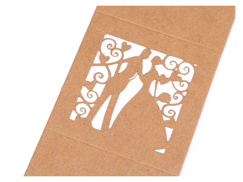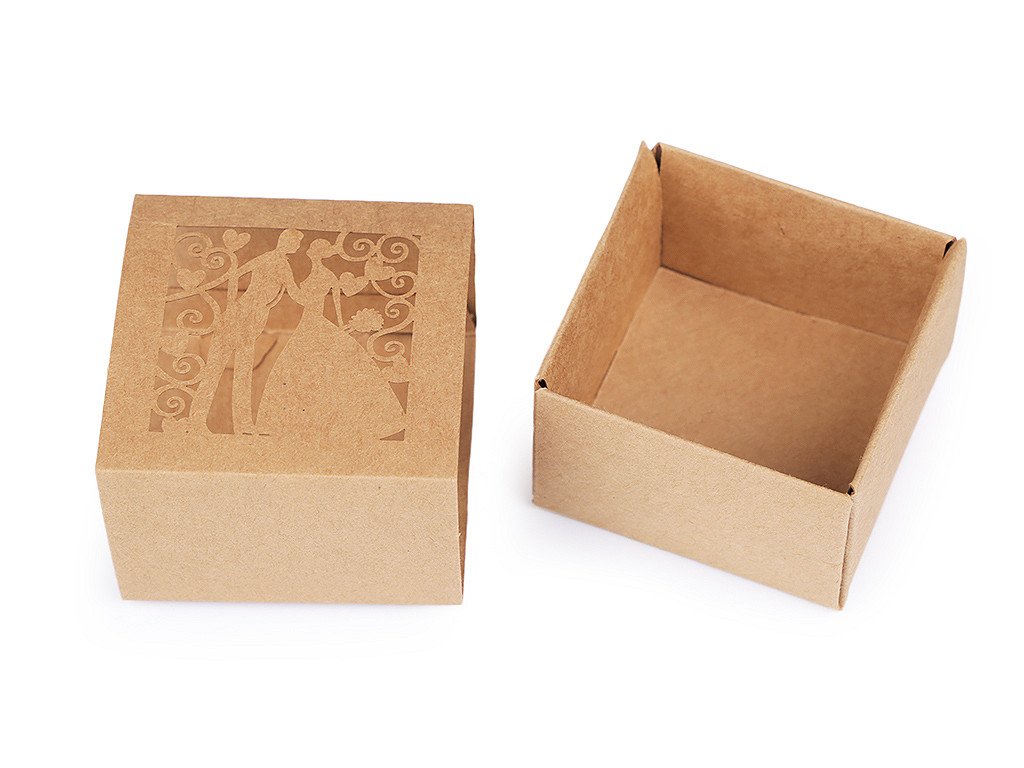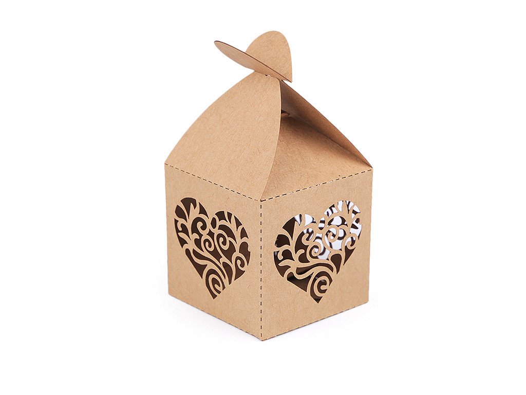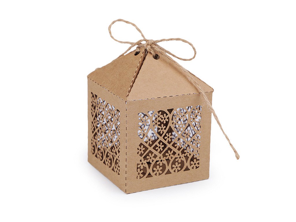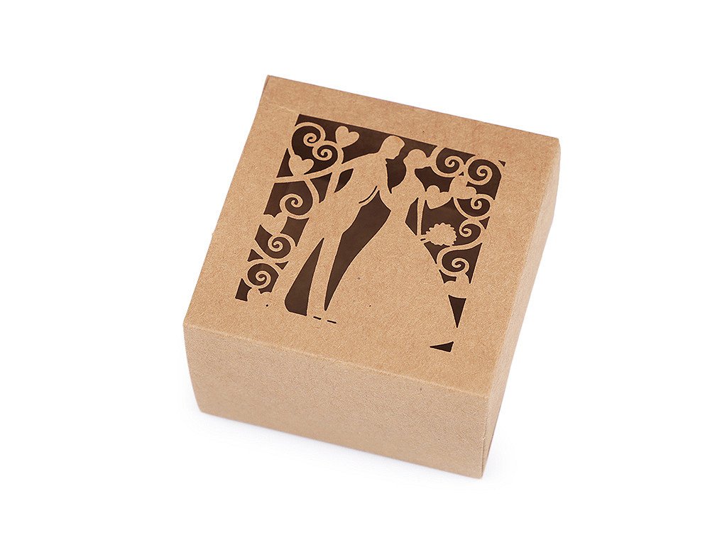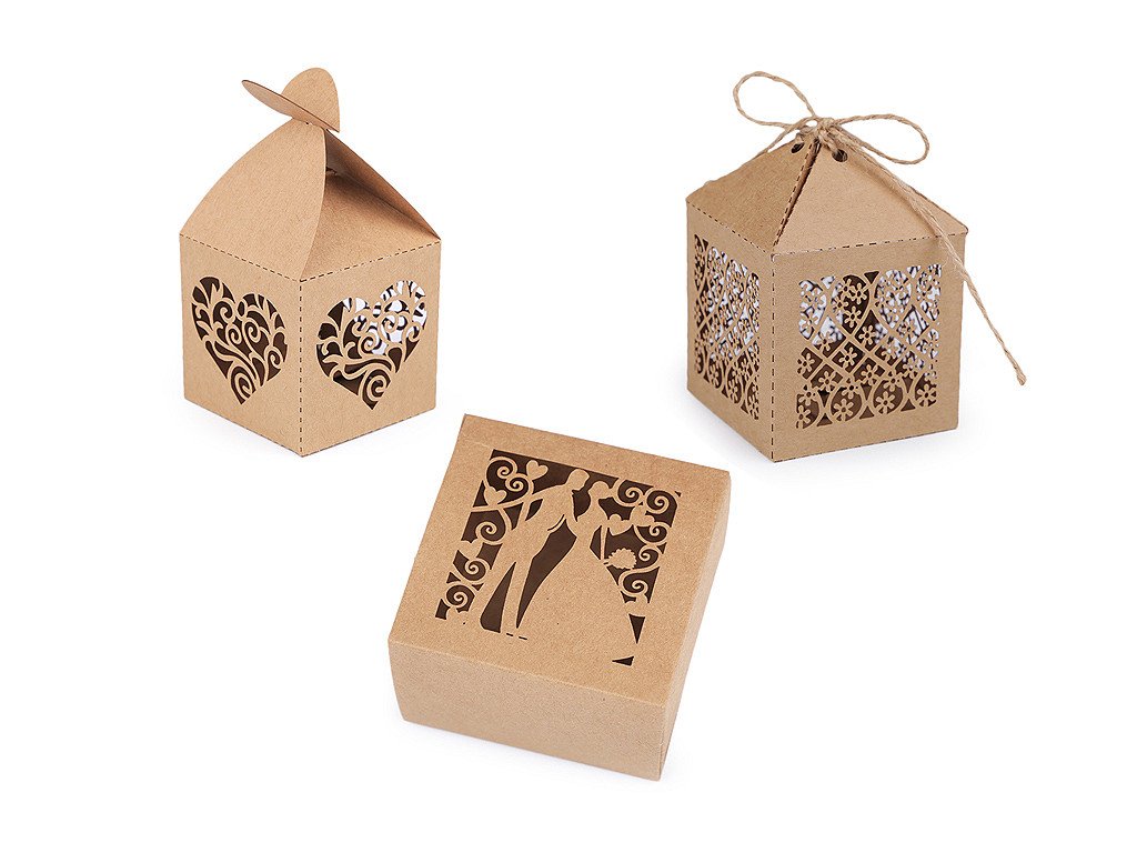 Papírová krabička v přírodním stylu má vyřezávaný filigránový design. Papírové krabičky vám poslouží k uschování malých drobností a sladkostí pro svatební hosty (svatebních mandlí, pralinek, luxusních čokoládek, bonbonů apod.). Využijete je i k aranžování slavnostních tabulí během oslav. Krabičku dodáváme v rozloženém stavu. Složíte ji jednoduše podle vyznačených ohýbacích krajů.- Rozměry: č. 1: 5 x 5 x 9,5 cm