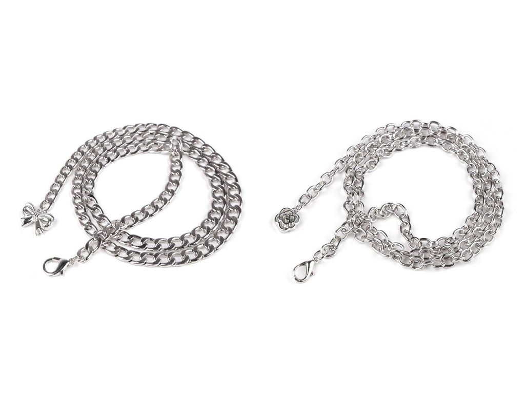 Dámský pásek z kovového řetízku je zajímavý módní doplněk. Jeden konec má ozdobený přívěskem, na druhém je karabina, díky které můžete pásek zapnout na potřebnou velikost. Pásek se hodí k šatům, tunikám apod. Pásek č. 1 je z plochých oček, široký 1,1 cm, maximální obvod je 111 cm. Má hmotnost 63 g. Pásek č. 2 je z oválných oček, široký 0,9 cm, maximální obvod je 113 cm. Má hmotnost 96 g. Pásek č. 3 je z oválných oček, široký 1,5 cm, maximální obvod je 128 cm. Má hmotnost 72 g.- Rozměry: č. 1: 1,1 x 111 cm