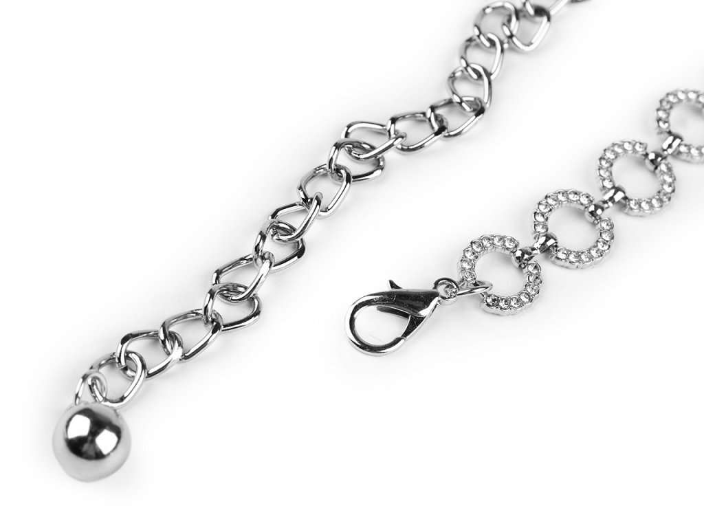 Dámský štrasový pásek bude patřit k elegantním kouskům ve vašem šatníku. Díky broušených kamínků se efektně třpytí. Jeden konec má ozdobený kovovou kuličkou, na druhém je karabina, díky které můžete pásek zapnout na potřebnou velikost. Pásek se hodí k šatům, tunikám apod. Pásek je široký 1,5 cm, minimální obvod po zapnutí je 62 cm, maximální obvod je 109 cm. Má hmotnost 74 g.- Šířka: 1,5 cm