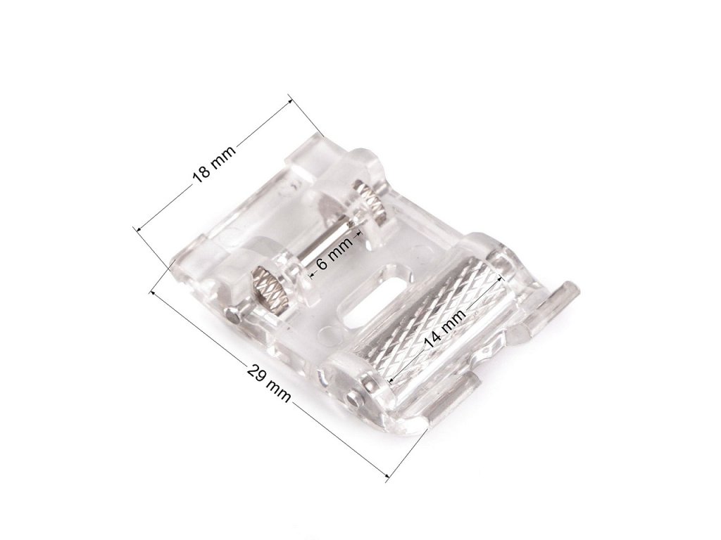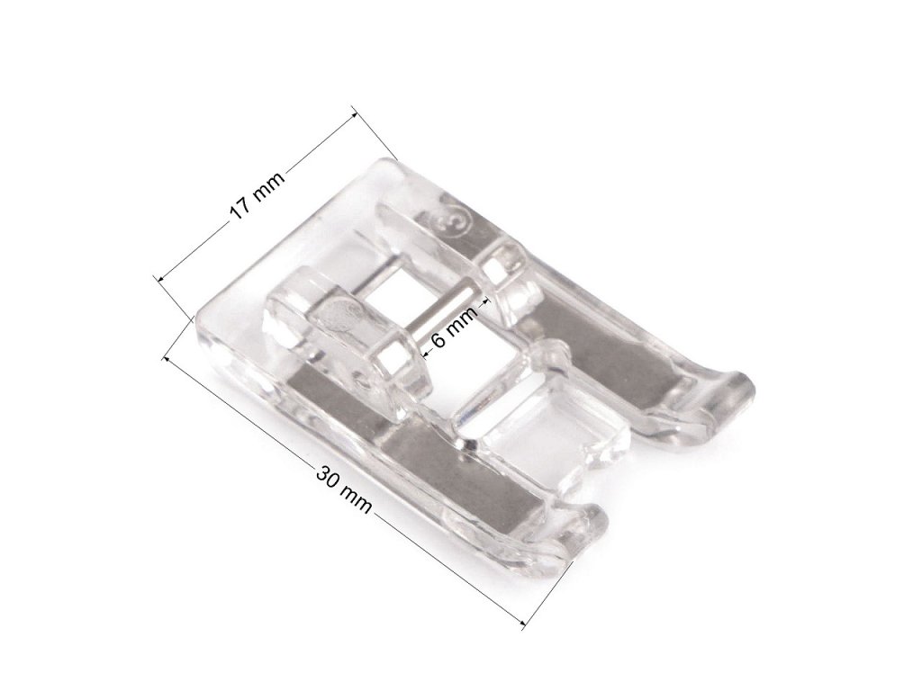 Plastové transparentní patky jsou vhodné pro většinu domácích šicích strojů - mají univerzální konstrukci a rychloupínací systém. Šířka úchopu na jehelní tyč je 6 mm. Varianta č. 1 je pro našívání aplikací. Šije velmi hustým "cik cak" stehem (neboli také saténovým stehem), který usnadňuje přišívání aplikací. Je vhodná i k našívání krajky či vyšívání dekorativních stehů. Varianta č. 2 je válcová patka. Vhodná pro těžké syntetické materiály, které se na klasickou patku "lepí". Při šití se materiál pod patkou nekrčí.- Rozměry: č. 1: 18 x 30 mm