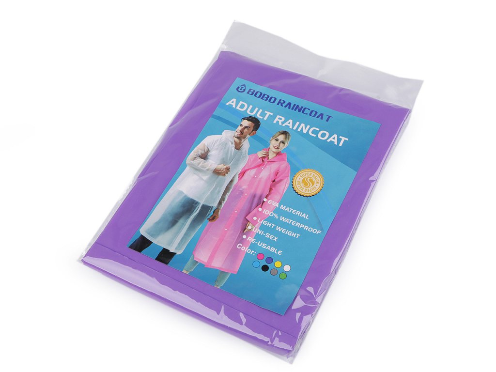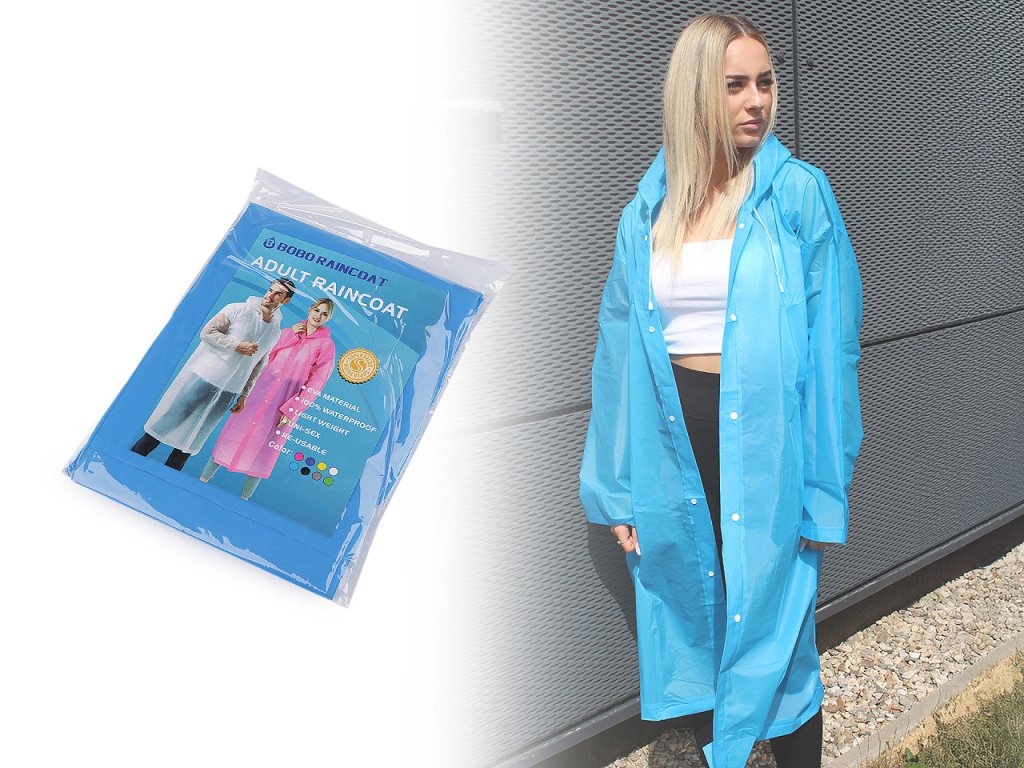 Pláštěnku využijete kdekoli, kde vás přepadne déšť. Je vyrobená z pevného materiálu, kapuce má stahovací šňůrku. Pláštěnka se zapíná na druky, je vložená do plochého sáčku. Pláštěnka měří: zadní délka cca 113 cm, délka rukávu (měřeno od kapuce po konec rukávu) 75 cm, obvod hrudi 130 cm.- Délka: 113 cm