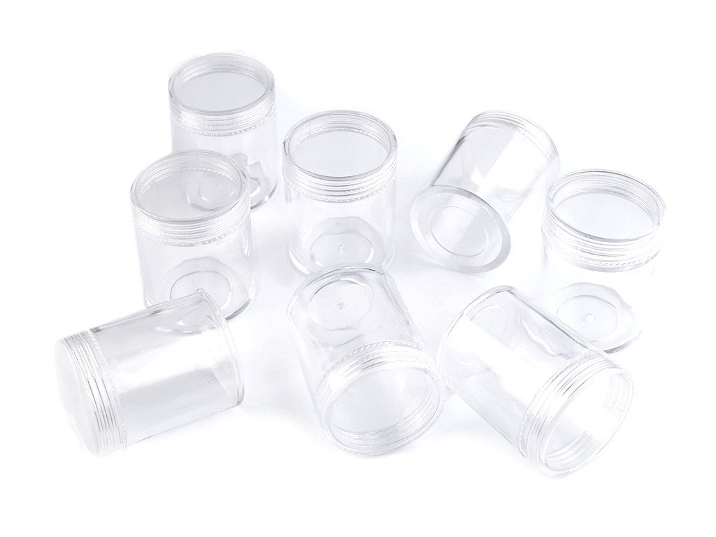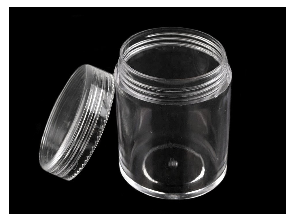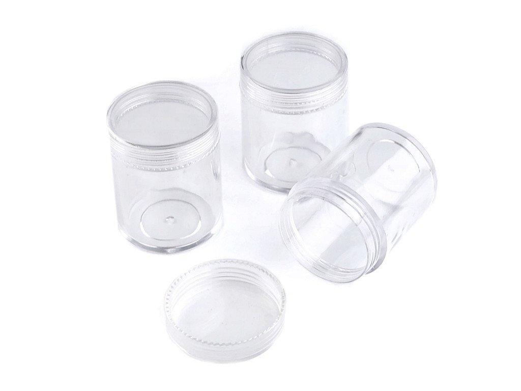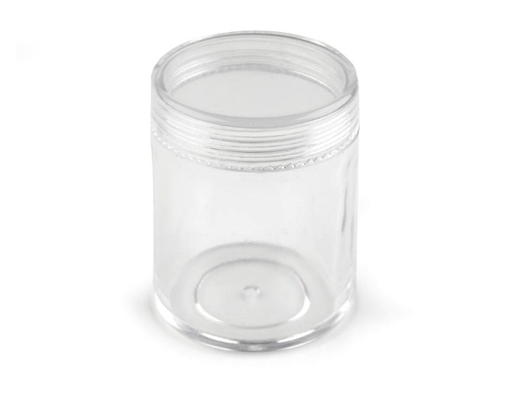 Plastová dóza je vyrobená z průhledného materiálu. Má šroubovací víko, vložené předměty se nerozsypou. Je vhodná pro praktické uložení rokajlu nebo větších korálků, na flitry či další drobnosti potřebné nejen pro výrobu bižuterie. Objem kelímku je 30 ml, 35 ml až po okraj. Rozměry dózy jsou 3,8 x 4,7 cm (průměr x výška). Vnitřní průměr otvoru je 3,3 cm. Rozměry víka jsou 1 x 3,8 cm (výška x průměr). Tloušťka plastu je 0,3 cm.- Průměr: 38 mm