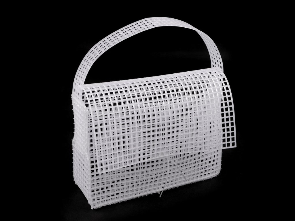 Plastová kanava je polotovar, ze kterého si můžete vyrobit malou kabelku s klopou o rozměrech cca 17,5 x 13,5 x 5 cm. Kabelka má navíc ucho o šíři 2,5 cm a délce 38 cm. Na výrobu využijte silnější přízi, která je určená k pletení či háčkování. Použít můžete i šňůru či odolnější stuhu (např. rypsovou). Kanavu po celém povrchu vyšijete přízí a sešijete po stranách. Otvor jednoho čtverečku má rozměry 4,5 x 4,5 mm.- Rozměry kabelky: 17,5 x 13,5 x 5 cm