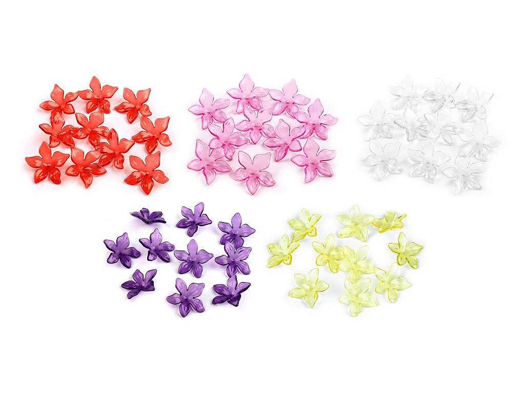 Půvabný plastový květ v transparentních barvách nadchne především korálkářky, které rády tvoří květinové šperky. Je velice lehký, vhodný i na náušnice. Květ můžete využít jako sukýnku k výrobě ketlovaných andělíčků, viz naše ilustrační foto. Na našem specializovaném webu najdete detailní fotonávod na výrobu andělíčků.- Průměr: 25; 29 mm