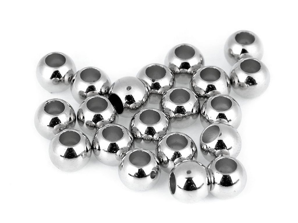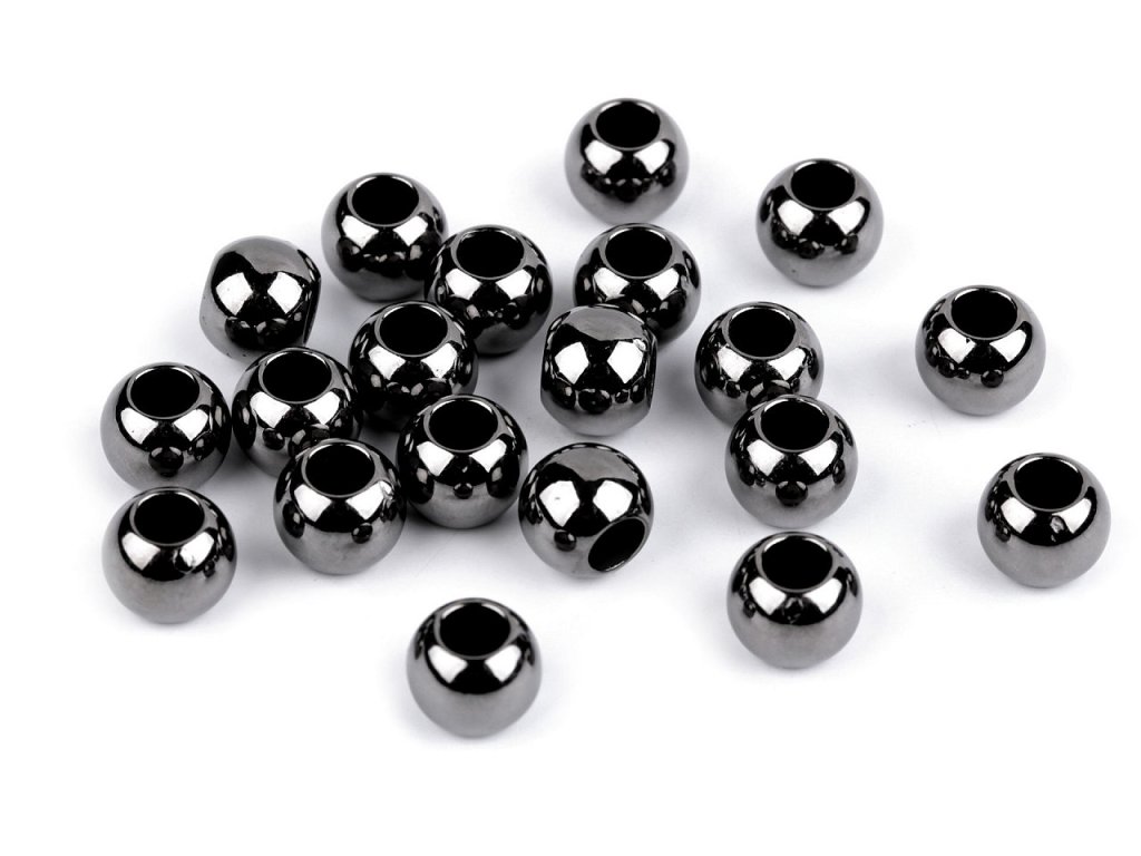 Plastové korálky s velkým průvlekem mají vysoký lesk, který věrně imituje opravdový kov. Oceníte jejich nízkou hmotnost. Využijete je na výrobu náramků nebo dlouhých i krátkých náhrdelníků. Jako návlekový materiál jsou vhodné šperkové šňůrky nebo hadí řetízky. Korálky můžete navlékat na větší množství tenkých šňůrek, které se mezi sebou různě uzlují a svazují a tvoří tak zajímavý celek. Korálky využijete nejen k výrobě bižuterie, ale i ke zdobení oděvů, tašek nebo plavek. Korálky jsou vhodné pouze pro šetrné ruční praní.- Průměr: 10 mm
