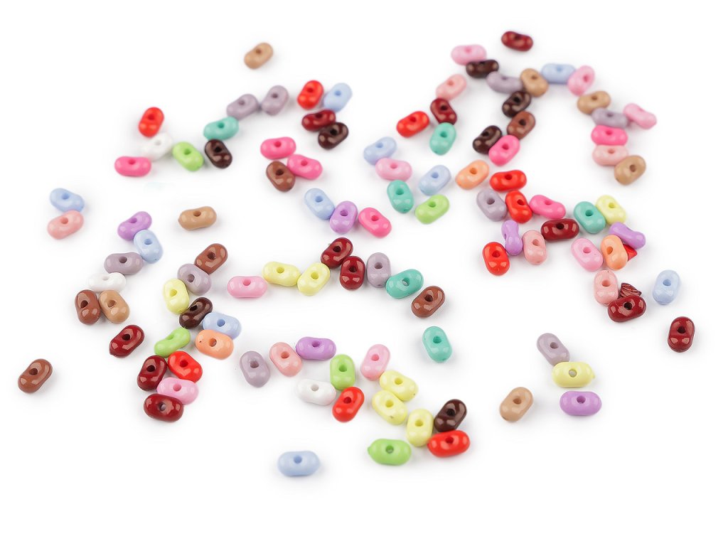 Malé plastové korálky mají zajímavý tvar arašídů. V barevném mixu představují dokonale hravý a veselý prvek pro každého milovníka tvoření. Na obou koncích jsou buclaté, uprostřed zmáčknuté, průvlek mají umístěný uprostřed korálku. Po navlečení vedle sebe vytváří zajímavý 3D efekt. Mají syté barvy, jsou velice kvalitní, všude hladké, nemají žádné otřepení nebo viditelné švy. Využijete je na výrobu bižuterie a zdobení oděvů, tašek či dekorací do bytu. V balení 10 g je cca 210 ks korálků.- Šířka: 4 mm