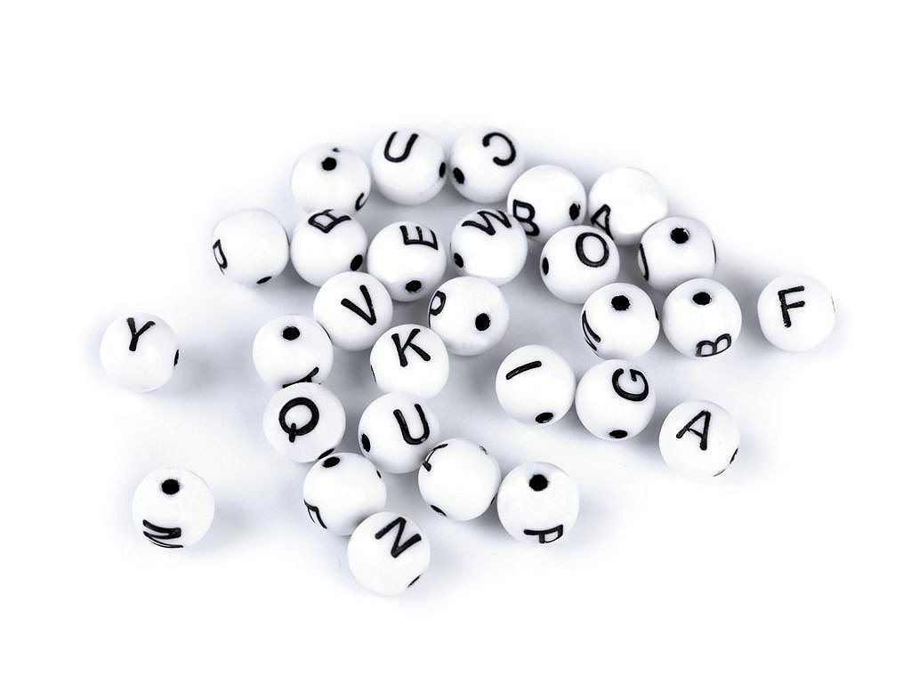 Kulaté korálky s písmenky potěší především školní děti. Mohou vyrábět populární náramky a náhrdelníky přátelství se jménem obdarovaného. Horizontálně umístěný průvlek umožňuje skládat z písmen slova, jména apod. Tělo korálku má bílou barvu, písmena jsou černá. Písmeno je z přední i zadní strany korálku. Jako návlekový materiál můžete použít pruženky, silony apod. V sáčku je mix různých písmen, jednotlivá balení se od sebe mohou lišit. Mix je zcela náhodný, není možné určit si jednotlivá písmena. Písmena jsou bez diakritiky. V balení 25 g je 90 - 94 ks korálků.- Průměr: 8 mm