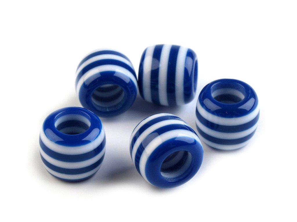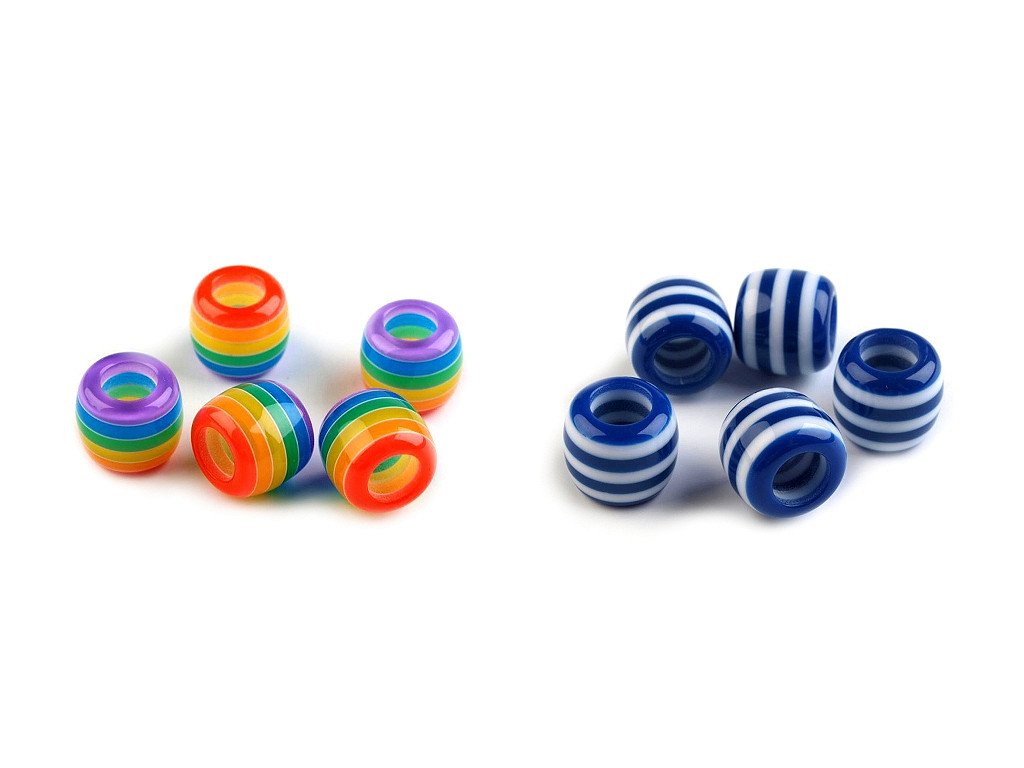 Plastové korálky s velkým průvlekem mají veselý proužkovaný design. Jsou velice kvalitní, všude hladké, nemají žádné otřepení nebo viditelné švy. Mají nízkou hmotnost. Využijete je do krátkých i dlouhých náhrdelníků nebo náramků. Jako návlekový materiál jsou vhodné šperkové šňůrky nebo hadí řetízky. Korálky můžete navlékat na větší množství tenkých šňůrek, které se mezi sebou různě uzlují a svazují a tvoří tak zajímavý celek. Díky precizně tvarovaného průvleku se hodí i k ozdobení vlasů, např. na copánky, dredy apod. Korálky využijete nejen k výrobě bižuterie, ale i ke zdobení oděvů, tašek nebo plavek. Korálky jsou vhodné pouze pro šetrné ruční praní.- Průměr: 12 mm