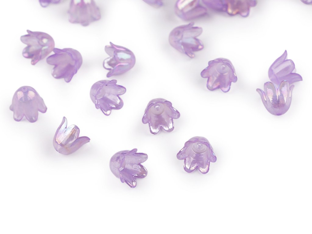 Plastové korálky květů ve tvaru zvonku nadchnou děti i dospělé. Jsou doslova magické, protože na povrchu mají nádherný lesk s AB efektem. Ocení je korálkářky, které rády tvoří květinové šperky nebo malé andělíčky. Korálky můžete použít na výrobu náhrdelníků, přívěsků ke klíčům, jako sukýnku na korálkové andělíčky, hodí se i k ozdobení tašek apod. Jejich velikou výhodou je nízká hmotnost. V balení 10 g je cca 50 ks květů.- Průměr: 11 mm