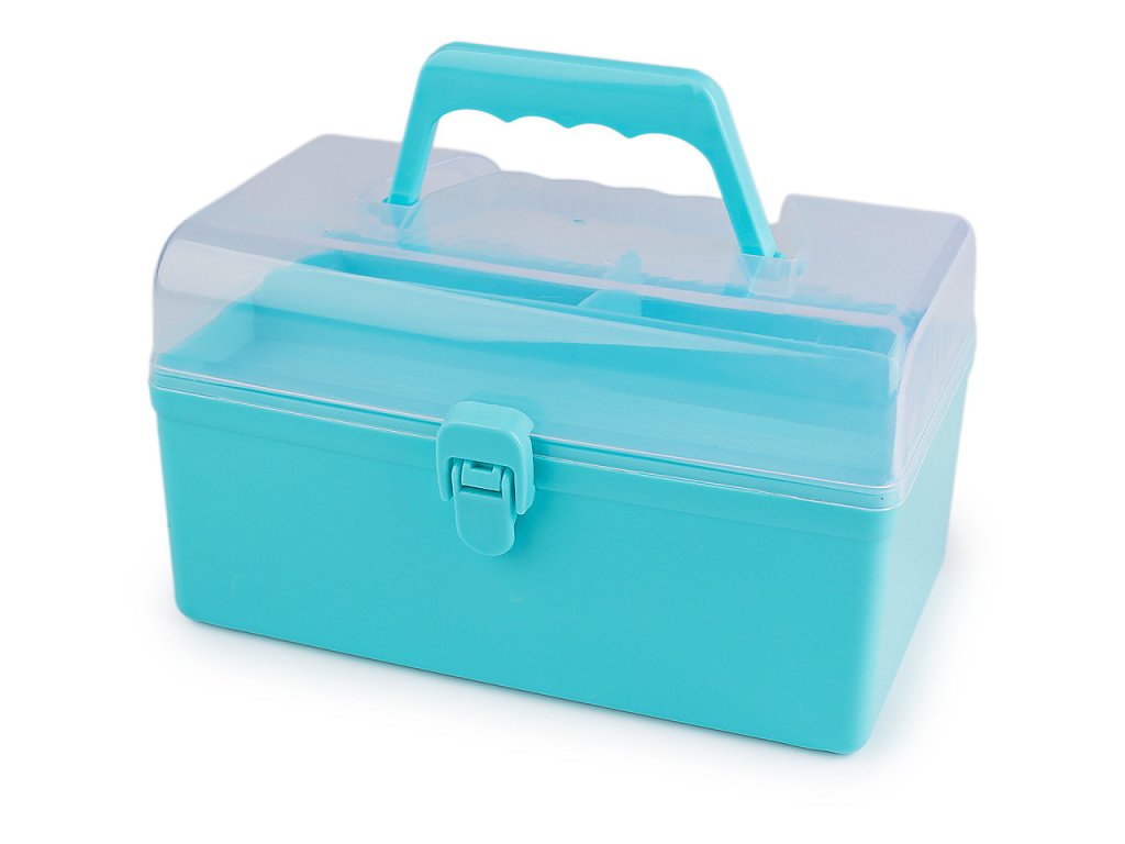 Průhledný zásobník s odnímatelným patrem je praktický pomocník při skladování komponentů a nářadí pro kreativní tvorbu. Má jednoduché pákové uzavírání a rukojeť na pohodlné přenášení. Je vhodný i pro švadleny, které ocení, že je dovnitř vidět. Odnímatelné patro na drobnosti má mělké přihrádky - jednu dlouhou a 2 malé, hluboké 1,5 - 2,5 cm. V dolním patře je prostor o rozměrech cca 12 x 20,5 x 6,5 cm.- Rozměry: 14,5 x 21,5 cm