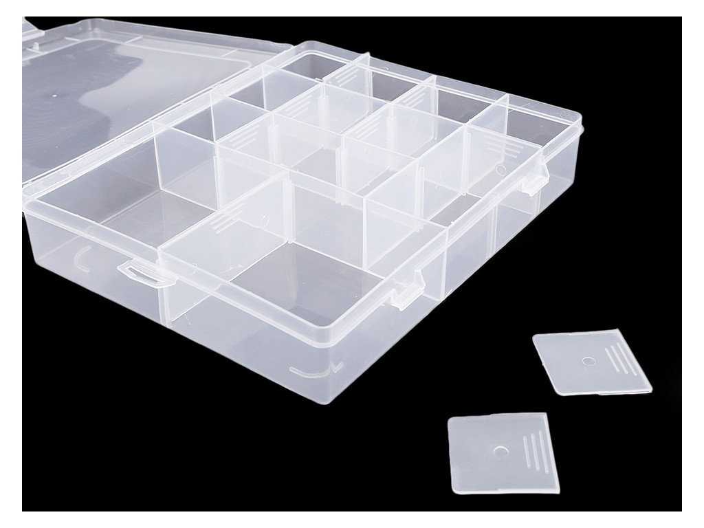 Praktická plastová krabička se hodí na úschovu drobného materiálu. Má 12 malých přihrádek o velikosti 4 x 4 x 3,5 cm a 2 větší přihrádky o velikosti 8 x 8 x 3,5 cm. Přihrádky si můžete regulovat pomocí odstranitelných přepážek. Krabička je uzavíratelná. Krabička č. 2 nemá závěs.- Rozměry: 17 x 21 x 4 cm