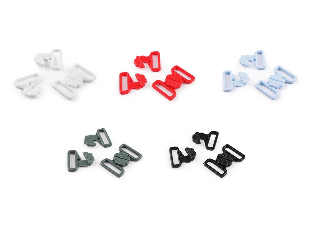 Plastové zapínání s designem květu využijete na plavky. Zapíná se vsunutím jednoho dílu mezi druhý díl a zacvaknutím. Rozměry jednoho dílu spony jsou 22 x 22 mm.