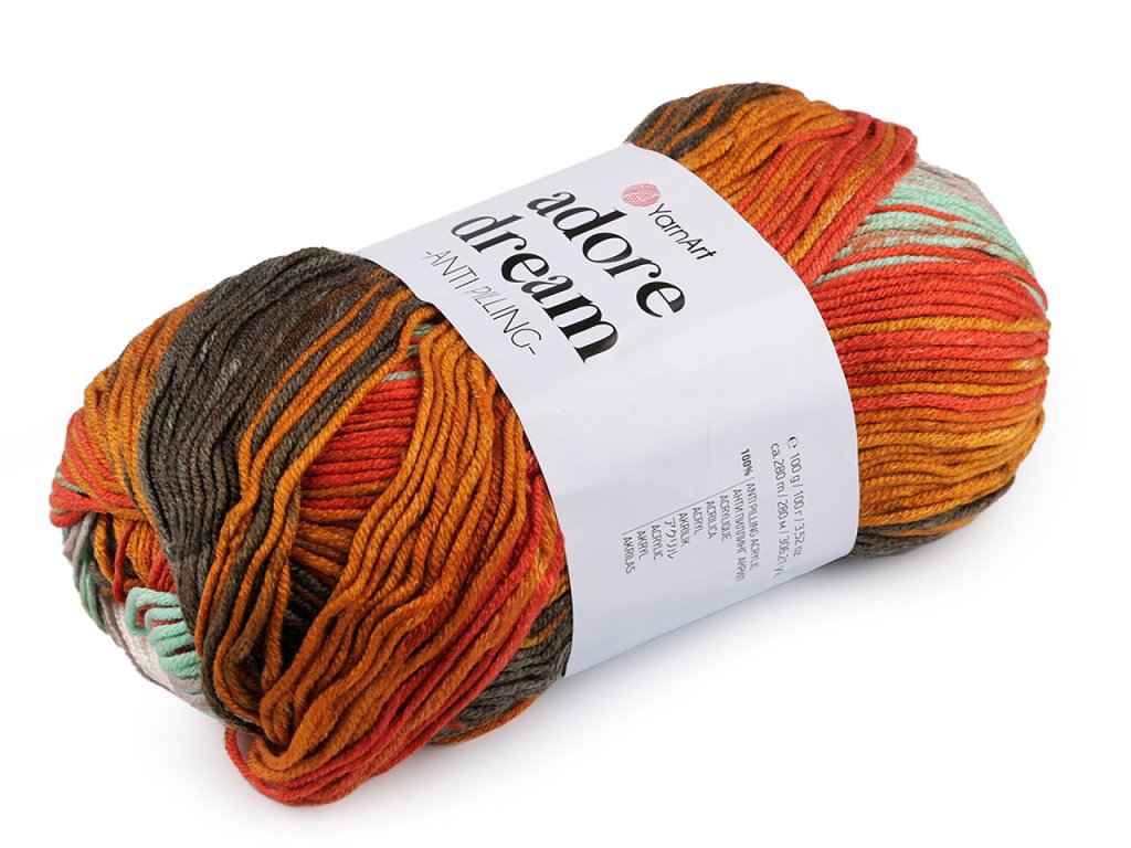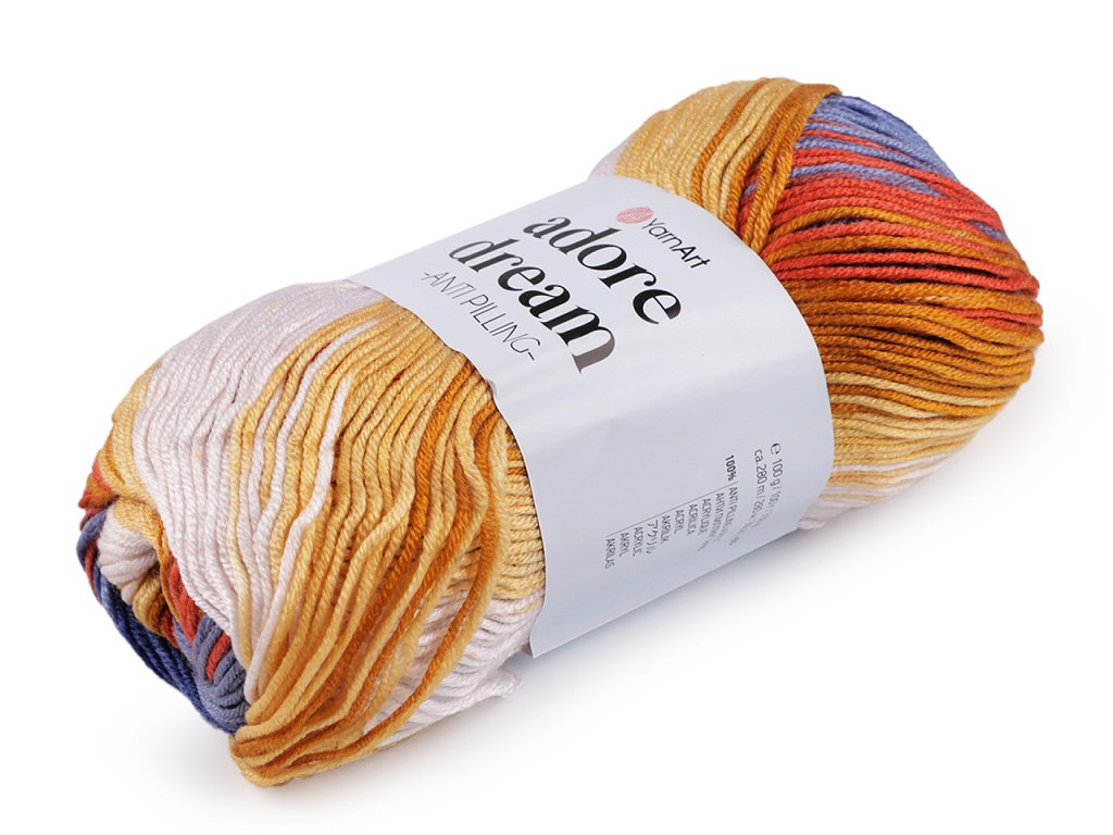 S pletací přízí Adore Dream vytvoříte zajímavé výrobky. Melírovaný efekt dokáže udělat s pletením či háčkováním divy. Má také antipillingovou úpravu, která zabraňuje žmolkování. Je vhodná na pletení či háčkování lehkých letních svetrů, čepic, kloboučků, ponožek apod. Velikost jehlic: 4 Velikost háčku: 4- Hmotnost: 100 g