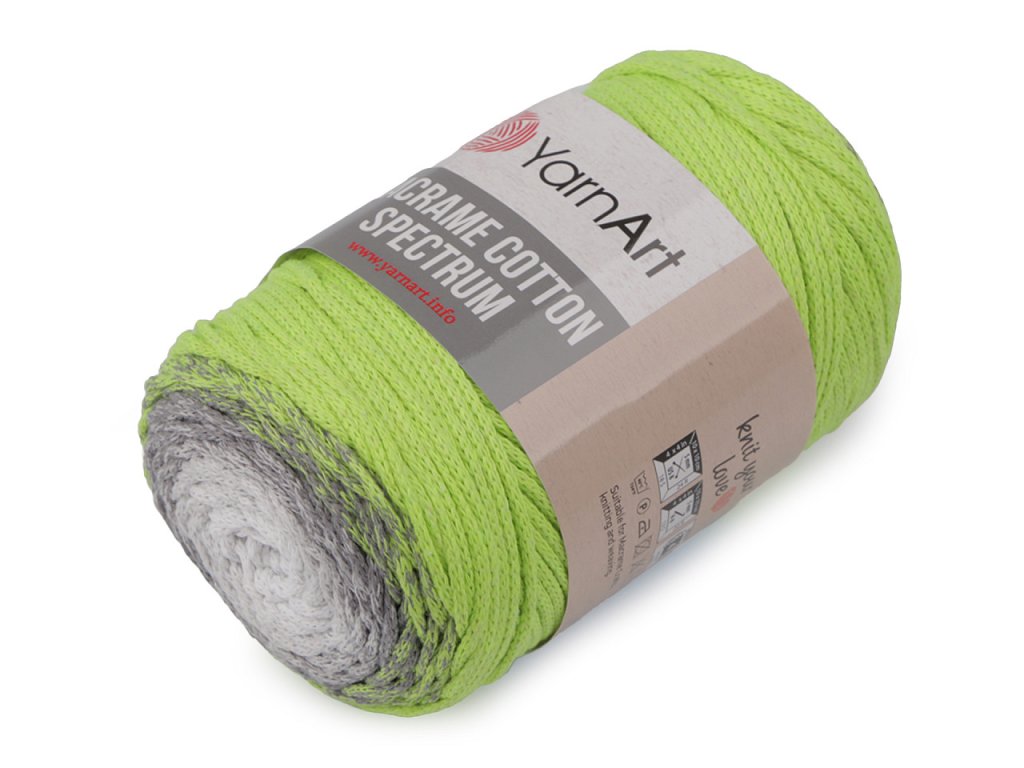 Příze Macrame Cotton Spectrum připomíná provázek. Je zajímavá svými barevnými přechody, se kterými budou všechny výrobky vypadat originálně. Využijete ji na pletení nebo háčkování pufů, košíků, koberečků i tašek, kde úžasně vyniknou její duhové přechody barev. Velikost jehlic: 5 Velikost háčku: 5- Průměr: cca 2 mm