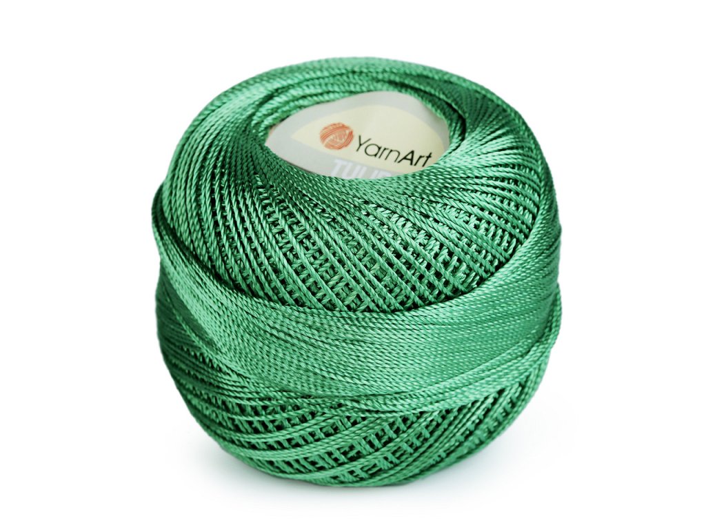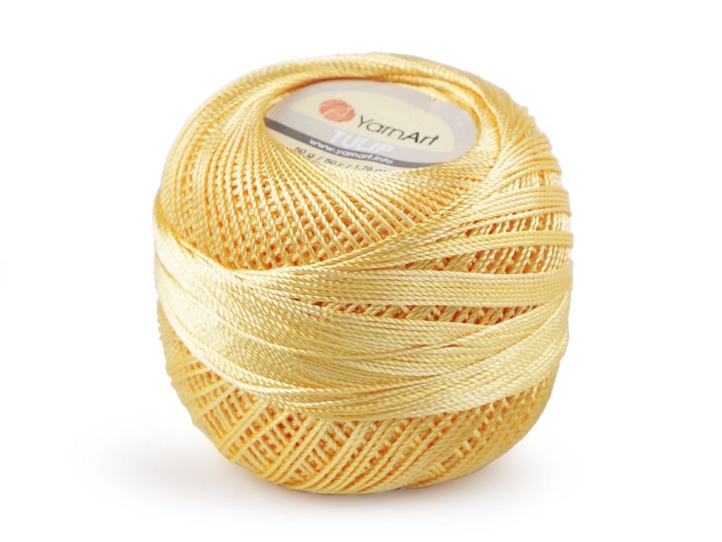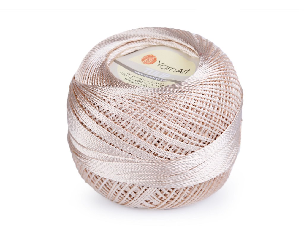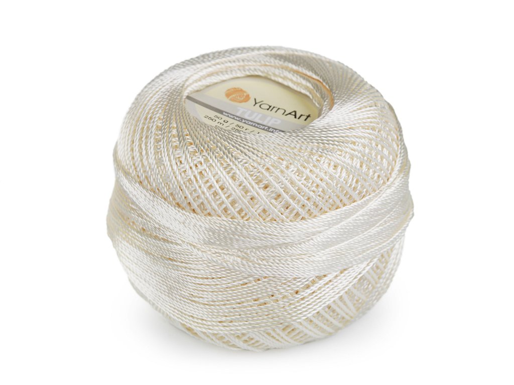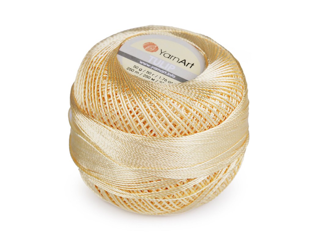 Příze Tulip vyniká vysokým efektním leskem. Je jemná a hladká. Využijete ji na háčkování, pletení, vyšívání (jak ruční, tak strojové), tkaní i kreativní tvorbu šperků.