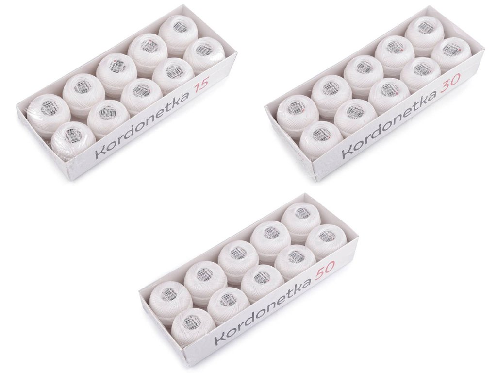 Háčkovací a paličkovací přízi Kordonetku nabízíme v několika tloušťkách. Je velice kvalitní, ze 100% bavlny. Je určená na háčkování deček, přehozů, záclon, apod. Je oblíbená na háčkování malých andělíčků a vánočních či velikonočních ozdob. Příze je vhodná i na paličkování. Každé klubko váží 20 g. Kordonetka č. 10 má návin cca 110 m a průměr příze 0,80 mm. Kordonetka č. 15 má návin cca 134 m a průměr příze 0,77 mm. Kordonetka č. 30 má návin cca 167 m a průměr příze 0,68 mm. Kordonetka č. 50 má návin cca 227 m a průměr příze 0,56 mm. Kordonetka č. 60 má návin cca 250 m a průměr příze 0,44 mm. Kordonetka č. 80 má návin cca 340 m a průměr příze 0,30 mm. Přízi dodáváme v balení po 10 ks v krabici bez víka, která je potažená samosmršťovací fólií.- Návin: 110 - 340 m