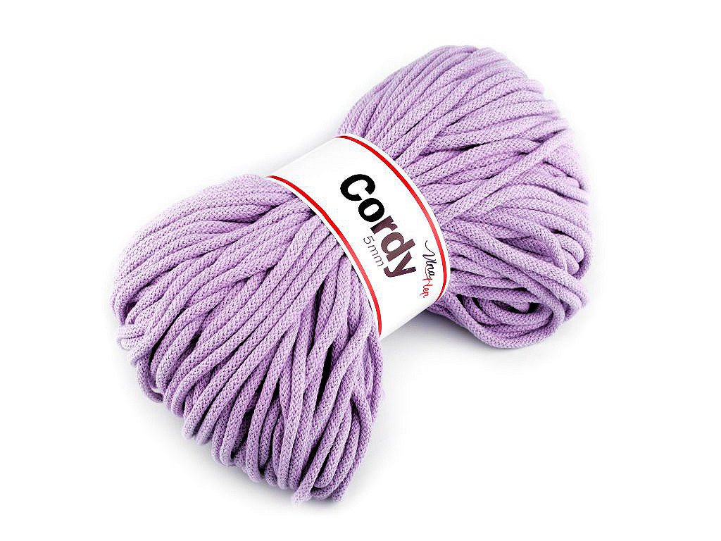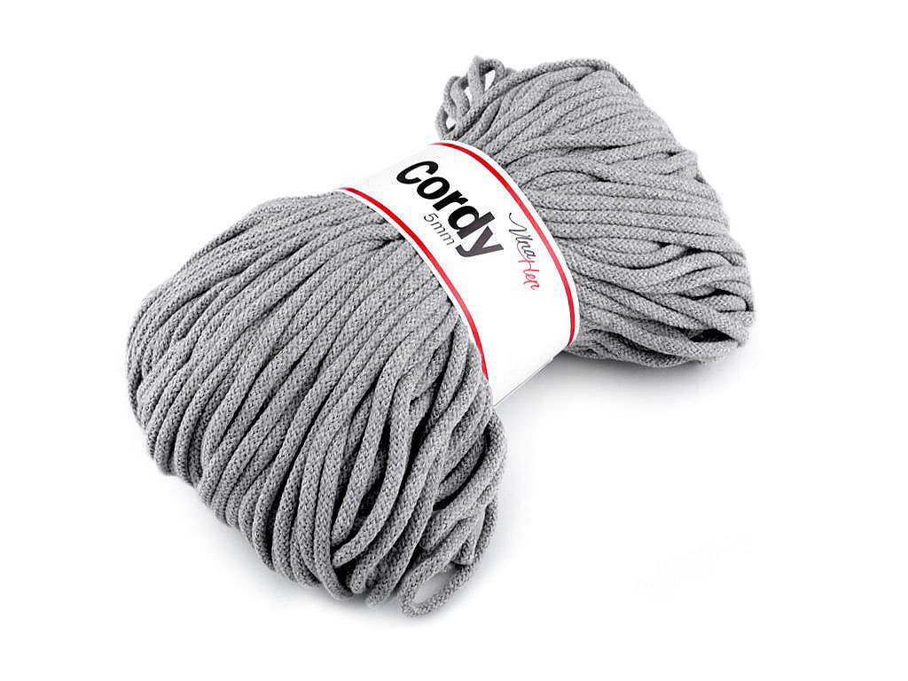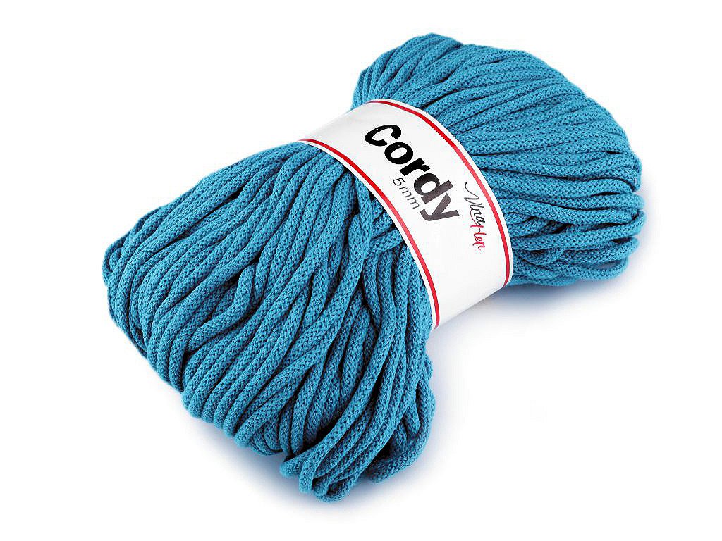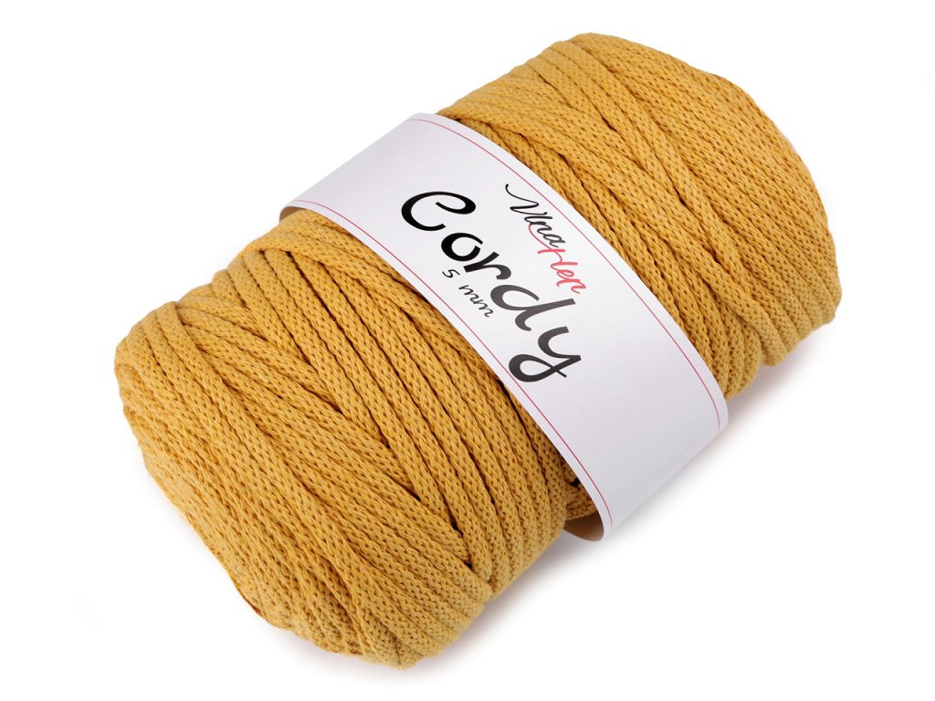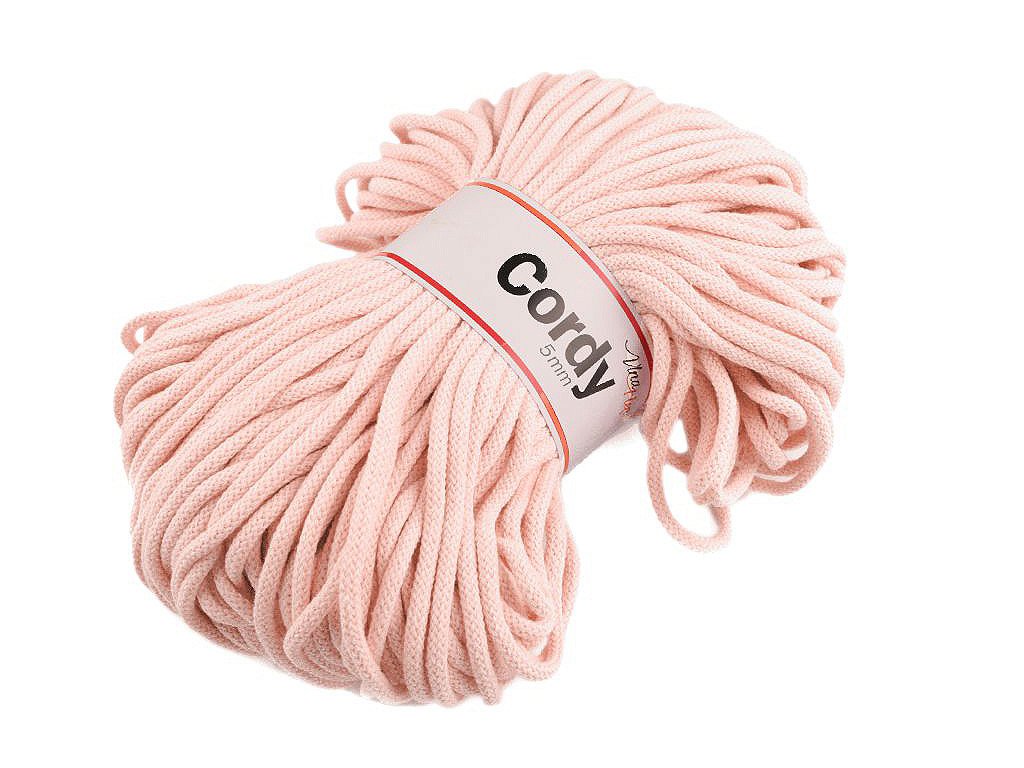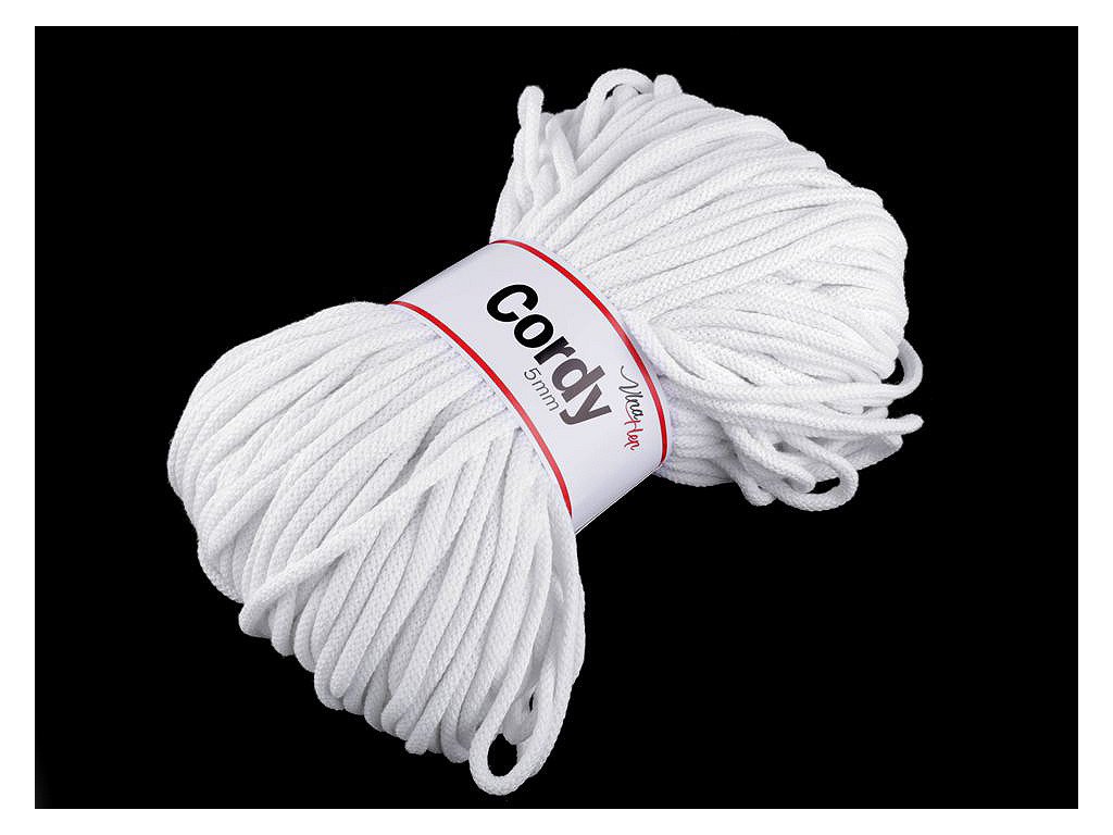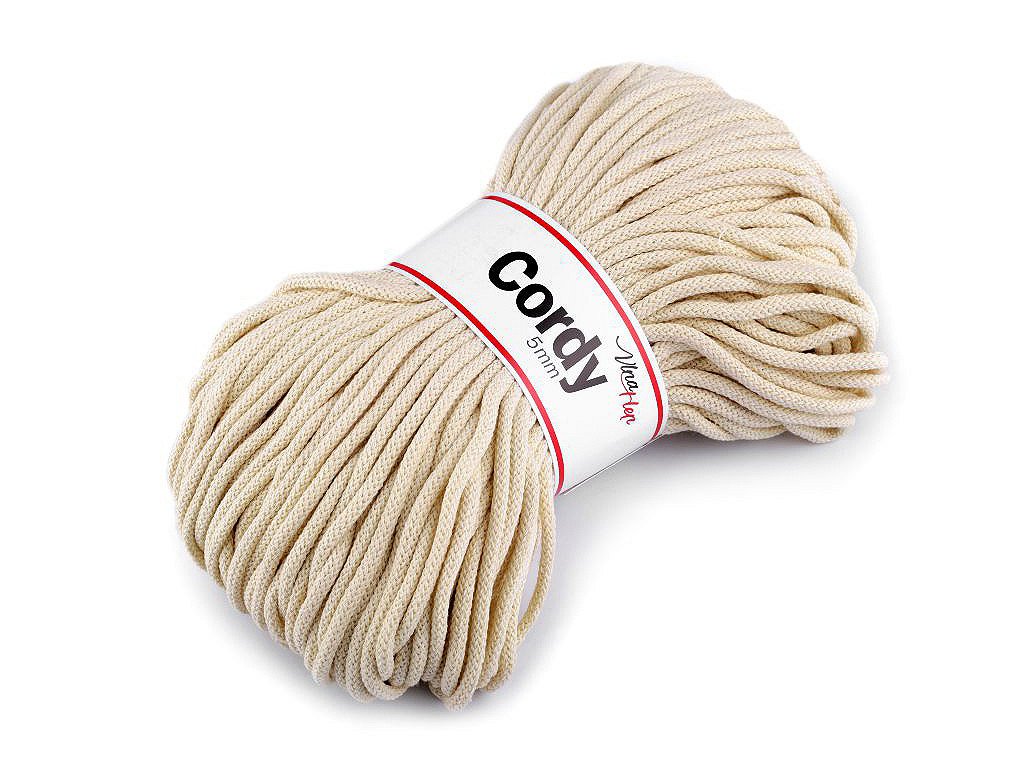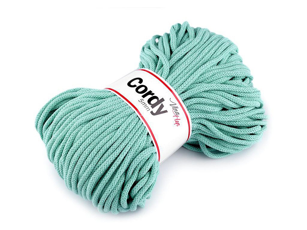 Provázkovou přízi Cordy tvoří tunýlek z bavlny, který je vyplněný polyesterovým vláknem. Je pevná a odolná, vhodná na pletení i háčkování. Využijete ji na výrobu pufů, košíků, koberečků, tašek, povlaků na polštáře, taburetů a jiných, převážně bytových, doplňků. Velikost jehlic: 8 - 10 Velikost háčku: 8 - 10 Vzorek na fotografii (44 x 37 cm) byl uháčkován z 1 klubíčka, háčkem č. 10.- Průměr: 5 mm