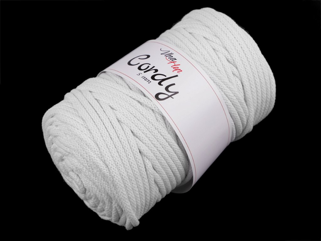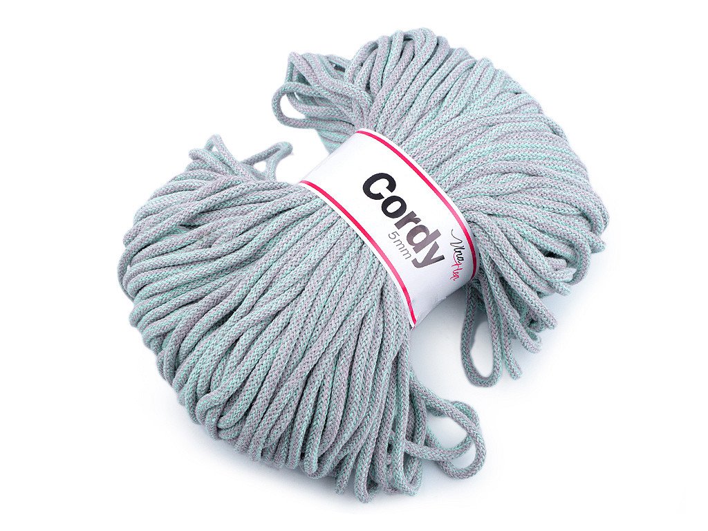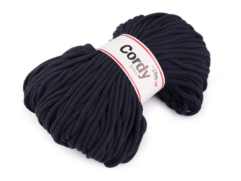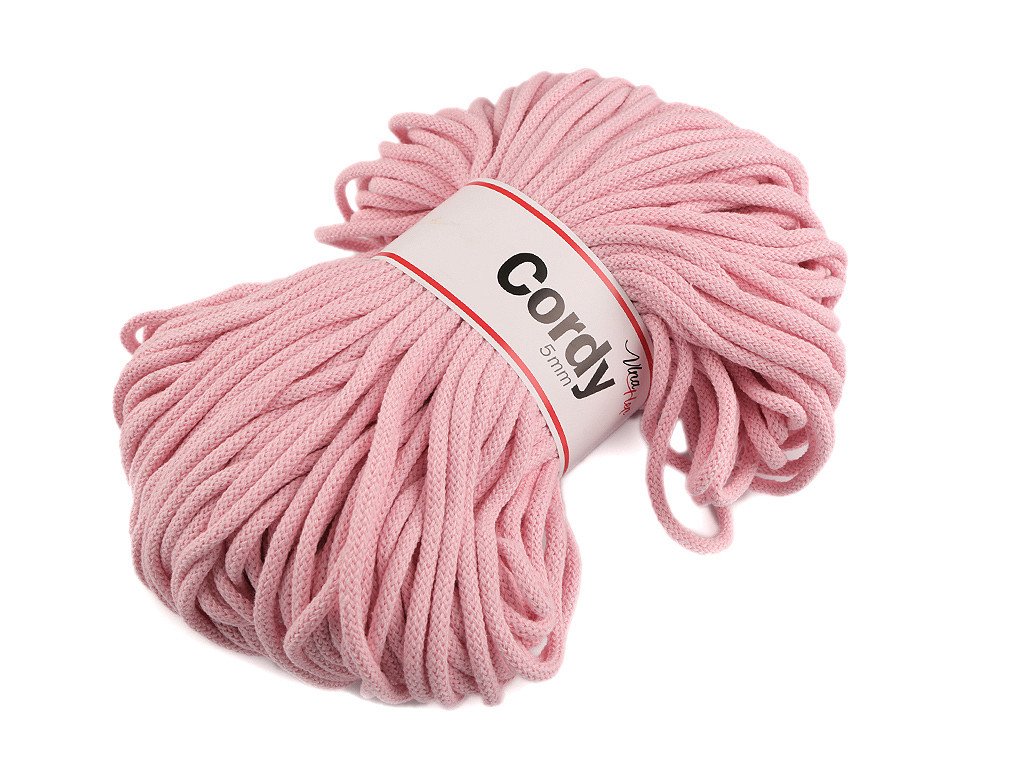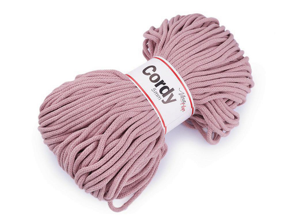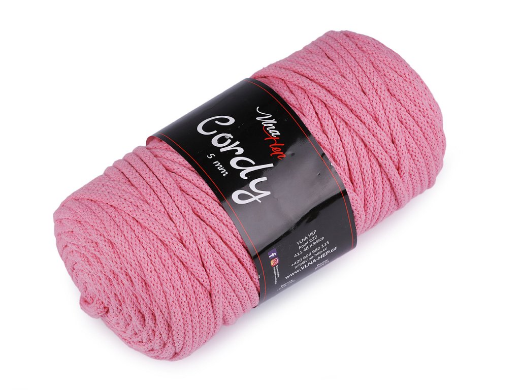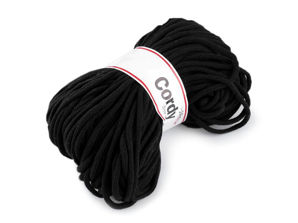 Provázkovou přízi Cordy tvoří tunýlek z bavlny, který je vyplněný polyesterovým vláknem. Je pevná a odolná, vhodná na pletení i háčkování. Využijete ji na výrobu pufů, košíků, koberečků, tašek, povlaků na polštáře, taburetů a jiných, převážně bytových, doplňků. Velikost jehlic: 8 - 10 Velikost háčku: 8 - 10 Vzorek na fotografii (44 x 37 cm) byl uháčkován z 1 klubíčka, háčkem č. 10.- Průměr: 5 mm