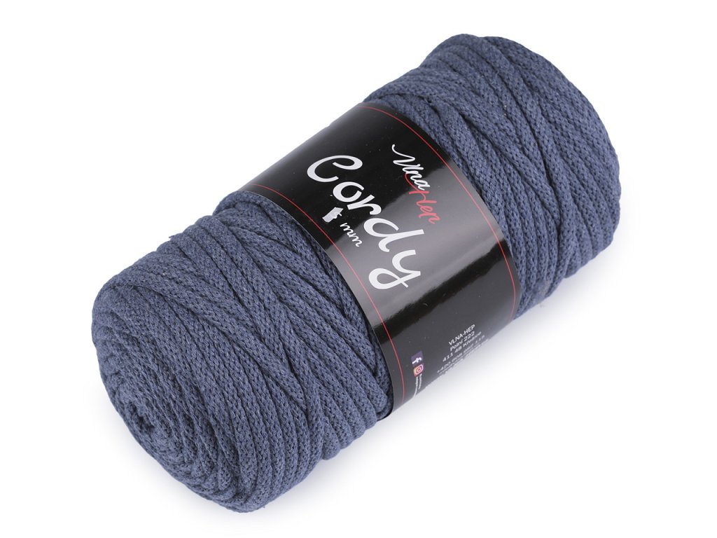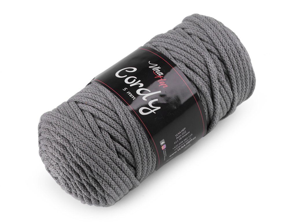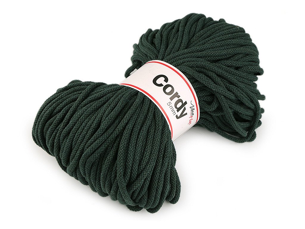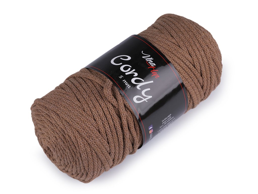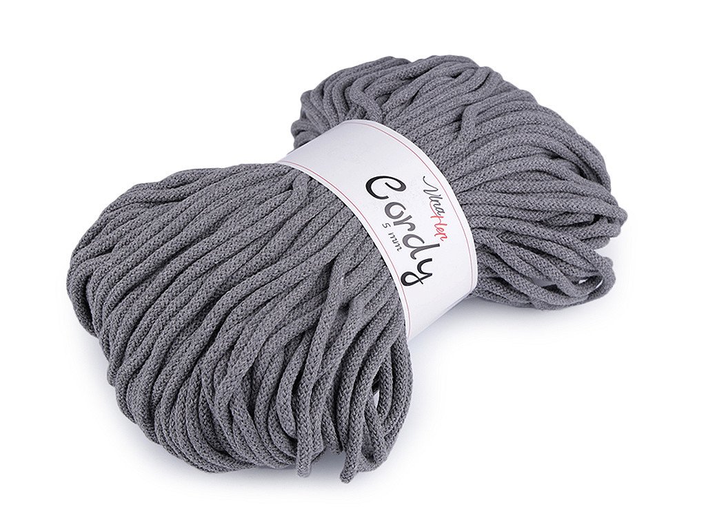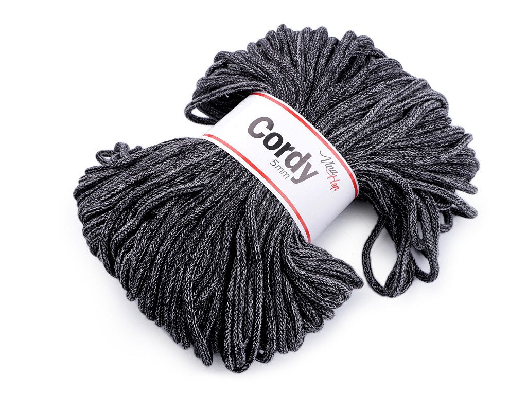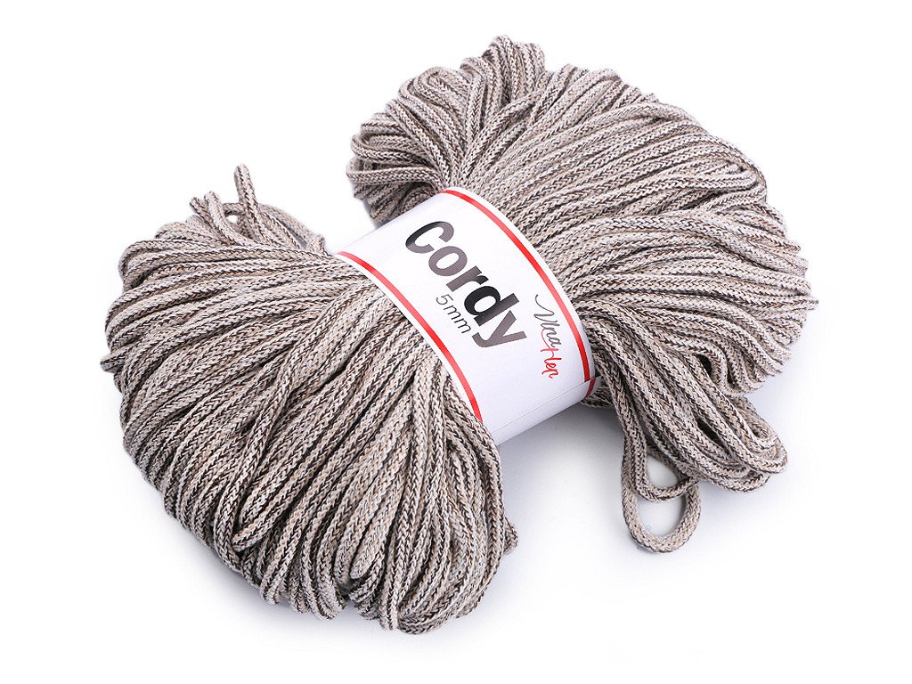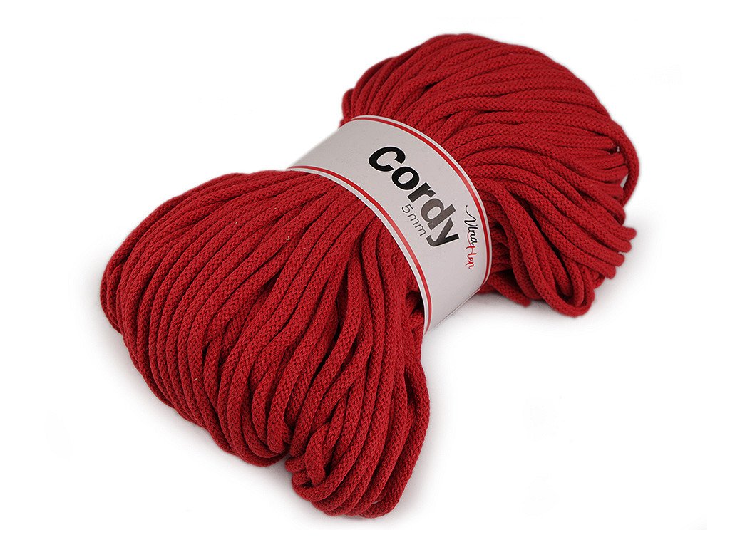 Provázkovou přízi Cordy tvoří tunýlek z bavlny, který je vyplněný polyesterovým vláknem. Je pevná a odolná, vhodná na pletení i háčkování. Využijete ji na výrobu pufů, košíků, koberečků, tašek, povlaků na polštáře, taburetů a jiných, převážně bytových, doplňků. Velikost jehlic: 8 - 10 Velikost háčku: 8 - 10 Vzorek na fotografii (44 x 37 cm) byl uháčkován z 1 klubíčka, háčkem č. 10.- Průměr: 5 mm