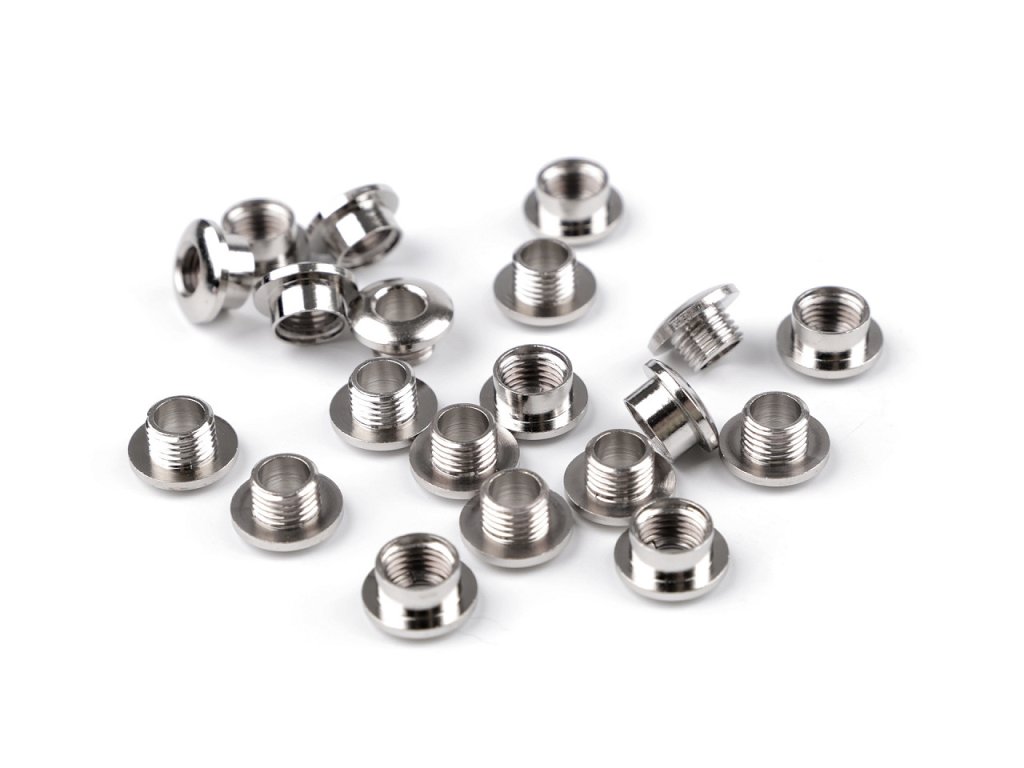 Průchodka se závitem se skládá ze dvou částí a má velmi jednoduchou aplikaci, kdy obě části do sebe jen zašroubujete. Využijete ji na kabelky, městské batohy, opasky, boty i oděvy. Je vhodná pro silnější materiály s tloušťkou cca 3,5 mm (např. flauš, filc, neopren). Výška obou spojených částí je 8 mm. Na látku doporučujeme použít sadu výsečníků- Vnitřní průměr průchodky: 5 mm