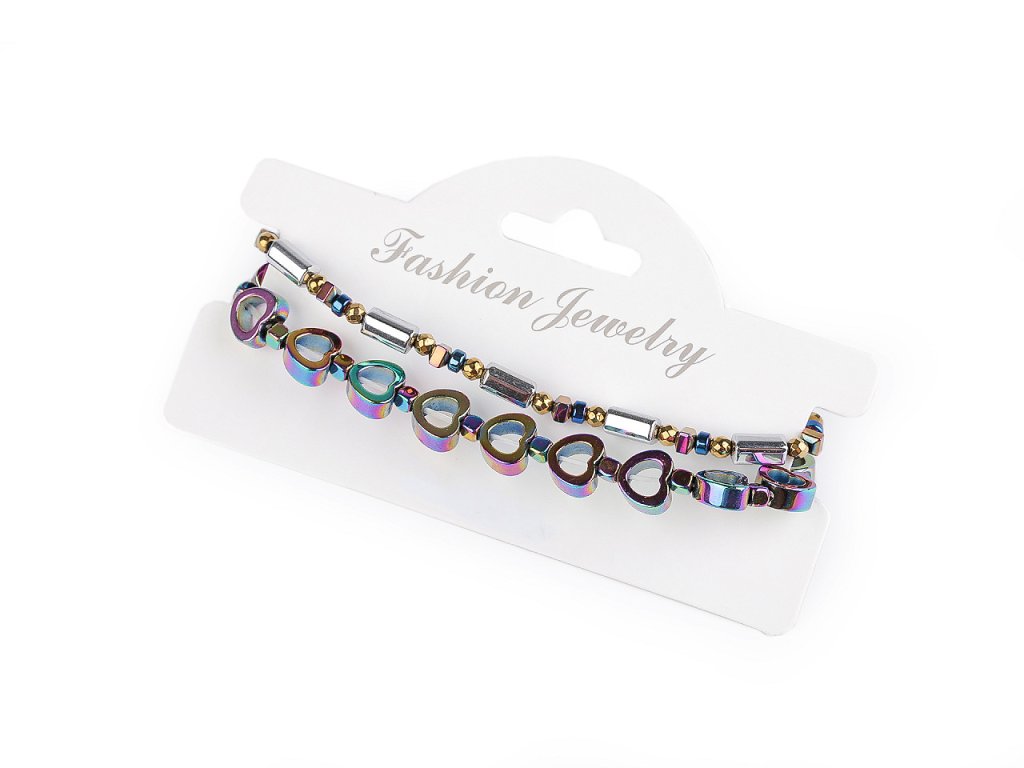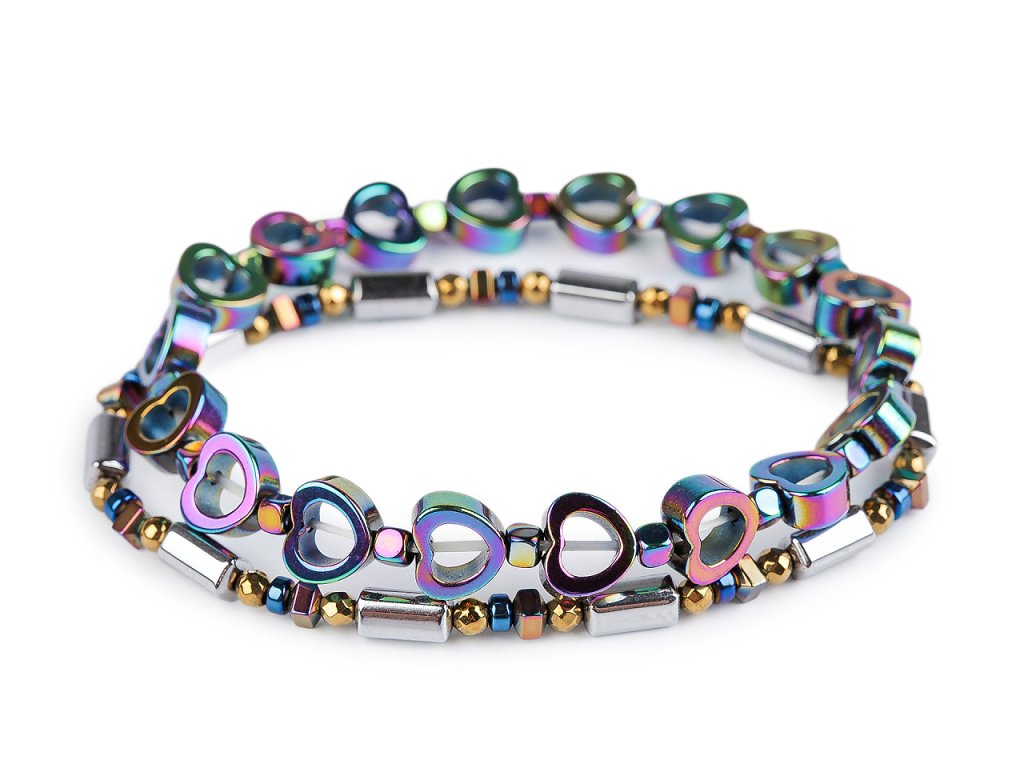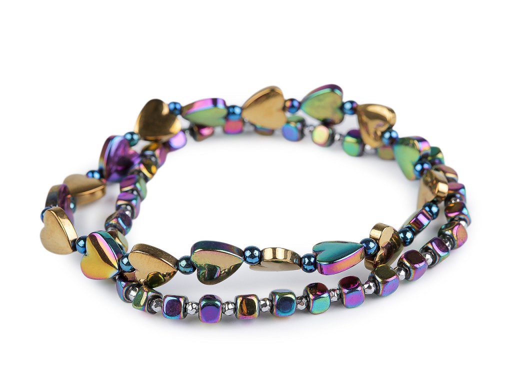 Sada 2 elegantních náramků vyrobených z broušených korálků pokoveného hematitu. Jeden je ozdobený motivem srdcí. Díky pružence se náramky snadno natahují na ruku, mají univerzální velikost. Patří mezi šperky, které díky své fascinující povrchové úpravě zaujmou na první pohled. Broušené plošky vytvářejí efektní světelné odlesky. Náramky potěší každou ženu, jsou dárkem, se kterým nešlápnete vedle.- Délka: 17 - 22 cm