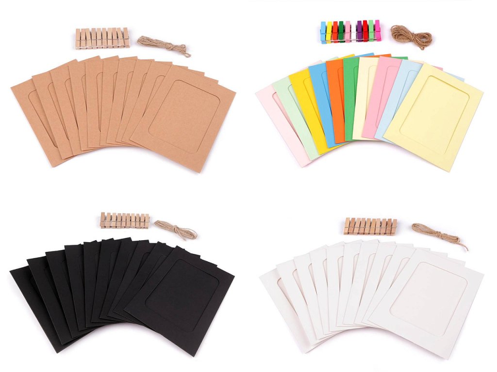 Sadu papírových rámečků s dřevěnými kolíčky a jutovou šňůrkou využijete na vystavení fotografií, pohlednic a malých obrázků. Vyniknou v každém interiéru, okamžiky na fotografiích tak budete mít neustále na očích. Sada č.1, 3 a 4 je určená na velikost obrázků 11 x 15 cm. Sada č.2 je určená na velikost obrázků 9,5 x 13 cm.- Rozměry: 11 x 15 cm