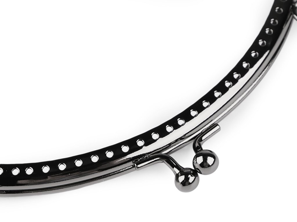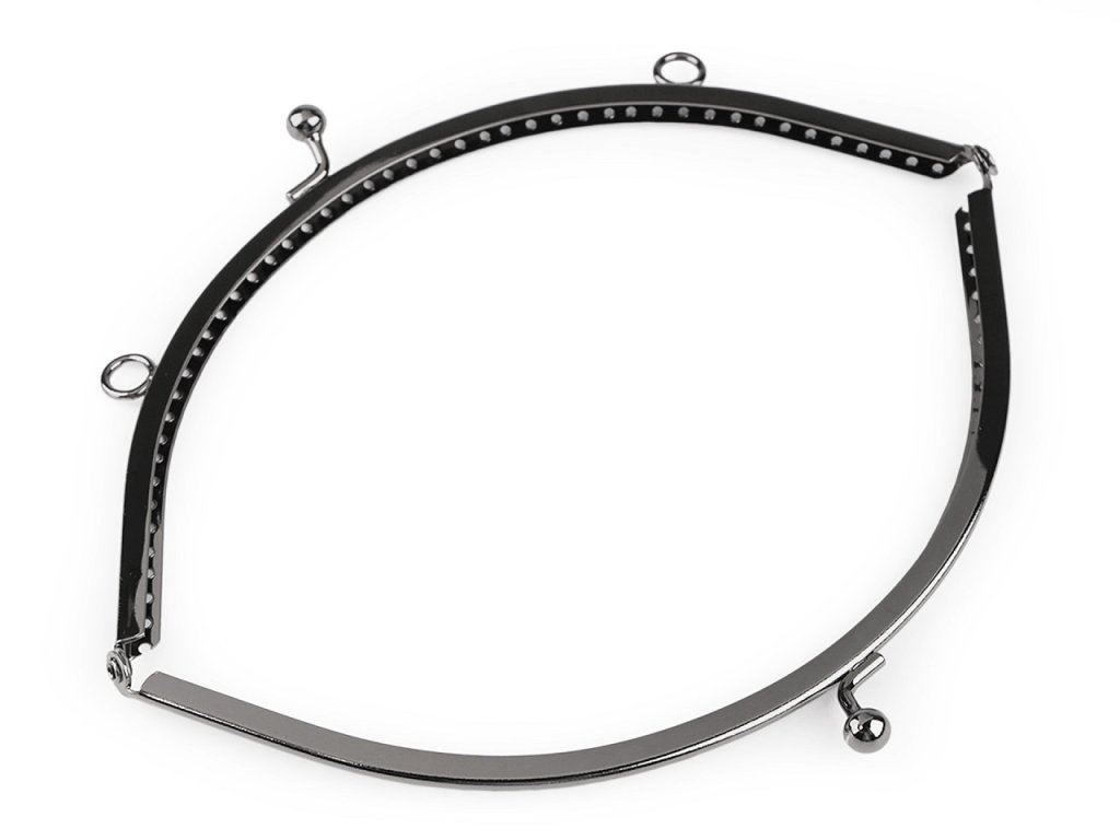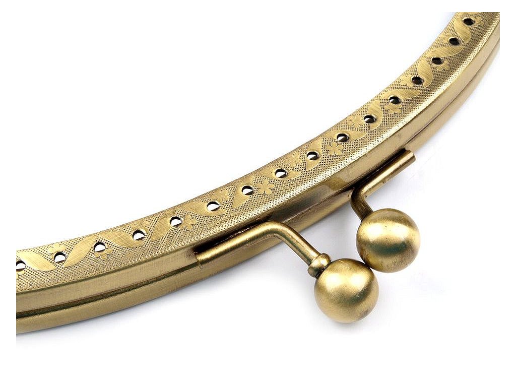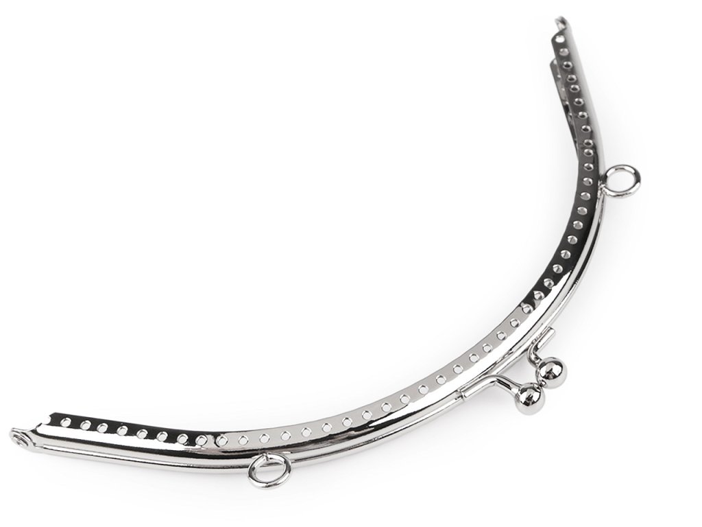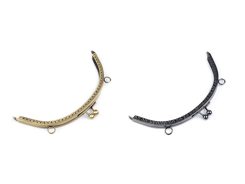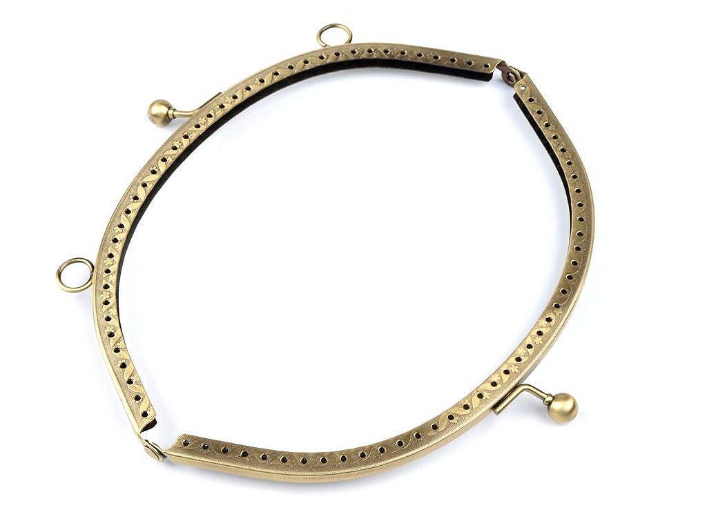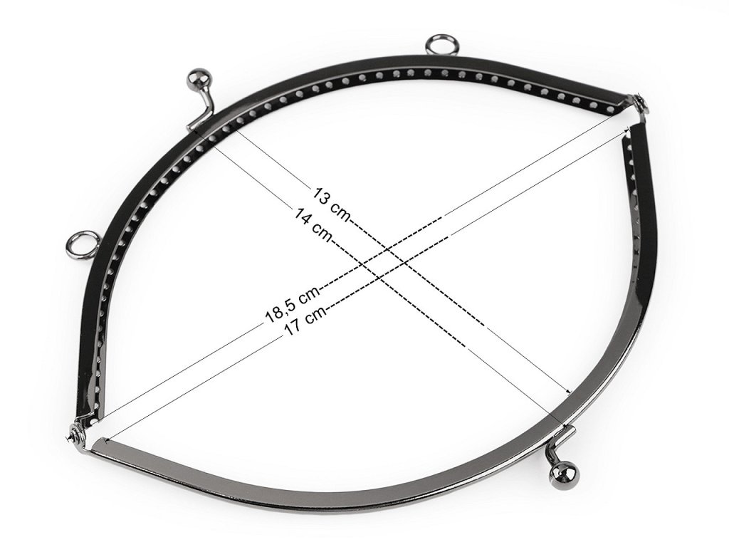 Kovový rámeček se zapínáním na výrobu kabelky. Zapínání má nahoře úchyty na ucha o průměru 1 cm. Rámeček je určený k našití, kdy se látka dovnitř vloží a ručně přešije přes dírky, jejichž rozpětí je 6 mm. Dírky jsou jen na vnější straně rámečku. Tento typ zapínání využijete určitě na jakýkoliv typ kabelky, ať už společenské nebo určené ke všednímu nošení. Vnitřní rozměry rozvoru jsou 17 x 13 cm. Vnější rozměry rozvoru jsou 18,5 x 14 cm. Výška zavřeného rámečku je 8 cm (10 cm včetně zapínání).- Zavřený rámeček: 18,5 x 8 cm