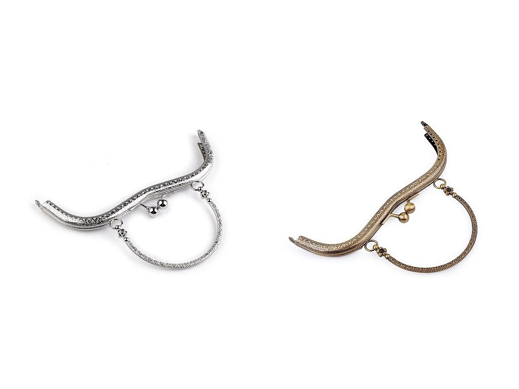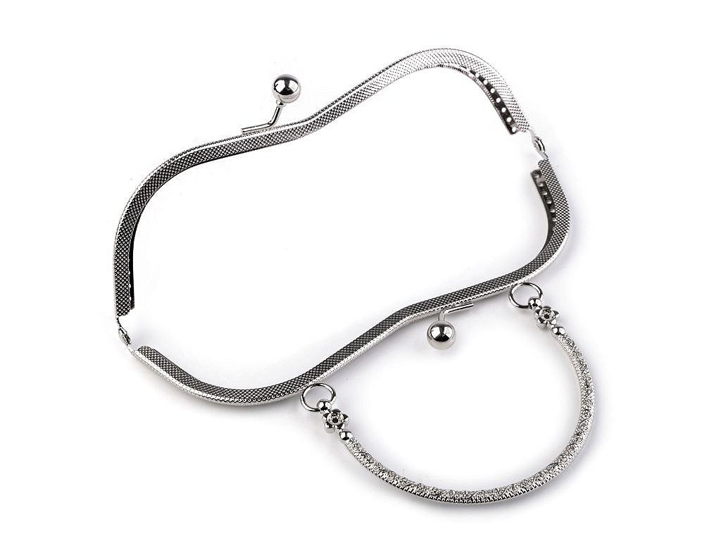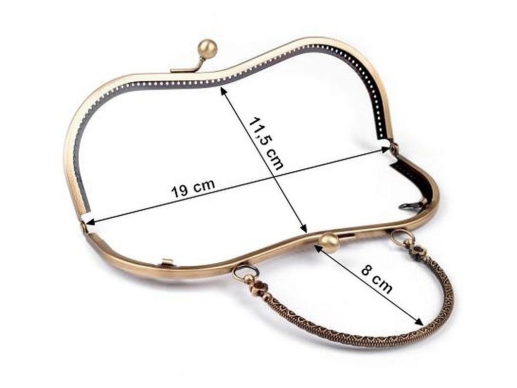 Kovový rámeček se zapínáním se používá na výrobu kabelky. Zapínání má úchyty na ucha o průměru 3 mm. Rámeček je určený pro našití, kdy se látka dovnitř vloží a ručně přešije přes dírky, jejichž rozpětí je 3 mm. Dírky jsou jen na vnější straně rámečku, která je delší než vnitřní, tudíž je našívání jednodušší. Tento typ zapínání využijete určitě na jakýkoliv typ kabelky, ať už společenské nebo určené ke všednímu nošení. Rozměry č. 1: Vnitřní rozměry rozvoru jsou 19 x 11,5 cm. Vnější rozměry rozvoru jsou 19,5 x 13 cm. Výška zavřeného rámečku je 7,5 cm (15,5 cm včetně ucha). Rozměry č. 2: Vnitřní rozměry rozvoru jsou 19 x 11,8 cm. Vnější rozměry rozvoru jsou 19,5 x 13,7 cm. Výška zavřeného rámečku je 7,5 cm (16 cm včetně ucha).- Zavřený rámeček: č. 1: 19,5 x 7,5 cm