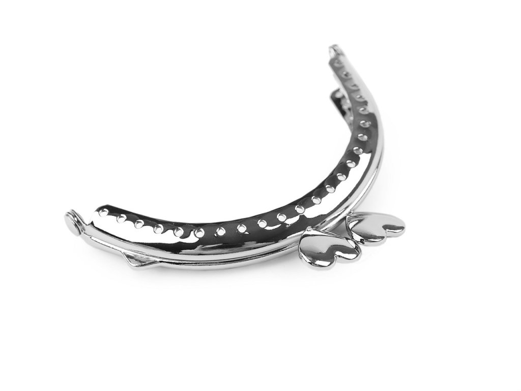 Kovový rámeček je vhodný na výrobu malé peněženky. Díky zavírání se srdíčky působí romanticky. Rámeček je určený k našití, kdy se látka dovnitř vloží a ručně přešije přes dírky, jejichž rozpětí je 5 mm. Dírky jsou jen na vnější straně rámečku, která je delší než vnitřní, tudíž je našívání jednodušší. Vnitřní rozměry rozvoru jsou 7,3 x 7,5 cm. Vnější rozměry rozvoru jsou 8,5 x 8,7 cm. Výška zavřeného rámečku je 4,5 cm (včetně zapínání 5,8 cm).- Zavřený rámeček: 8,5 x 5,8 cm
