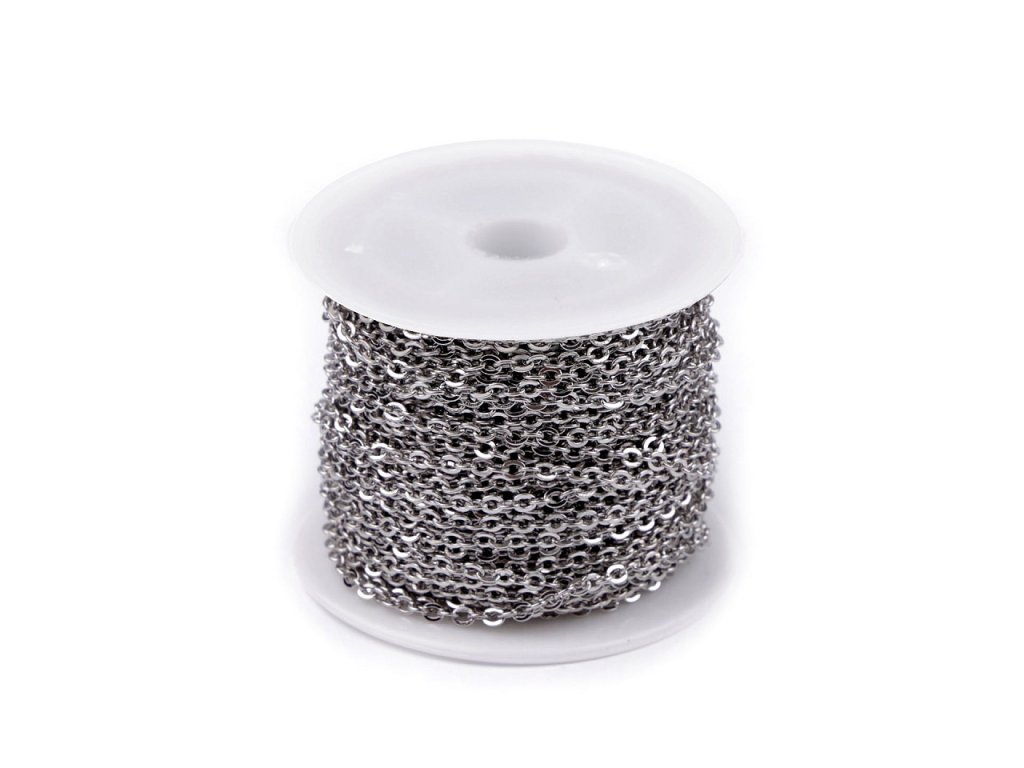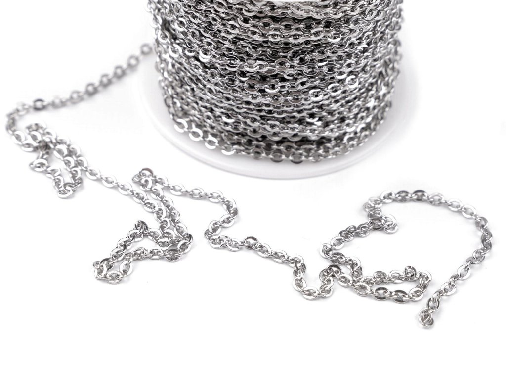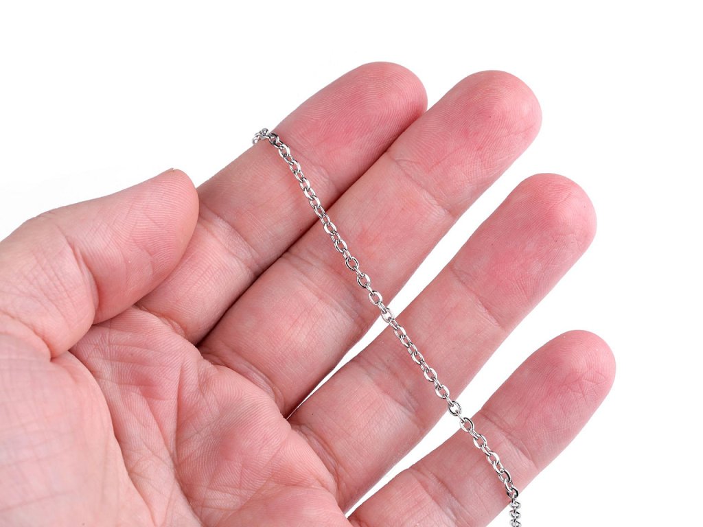 Nerezový řetízek z plochých oček je oblíbený komponent pro tvorbu bižuterie. Je pevný, velice kvalitní. Pomocí spojovacího kroužku na něj můžete připojit zapínání. Upozorňujeme zákazníky, že vnitřní průměr očka řetízku je velice malý. Průvlek očka je 0,8 mm, průvlek posledního očka je 1 mm. Přívěsek doporučujeme zavěsit na šlupnu, ketlovací jehla očkem řetízku projde velice obtížně.- Šířka: 2,3 mm