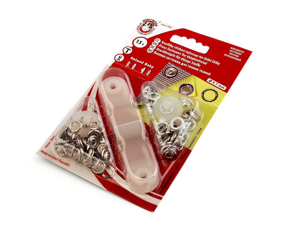 Knoflíky se používají ke spojování jemných a poddajných druhů látek - froté, úplet, košilovina aj. Nýtování se provádí mini lisem, který je součást balení. Jsou lakované.- Průměr: 10 mm