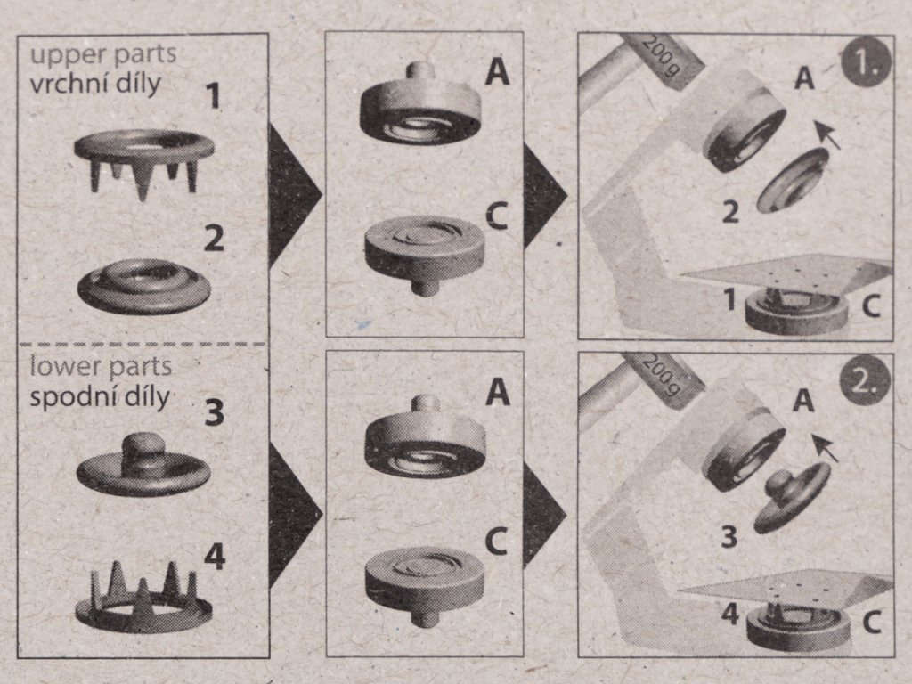 Knoflíky Roland Baby využijete ke spojování látek, zvládne i silnější látky. Nýtování se provádí mini lisem, který je součást balení.