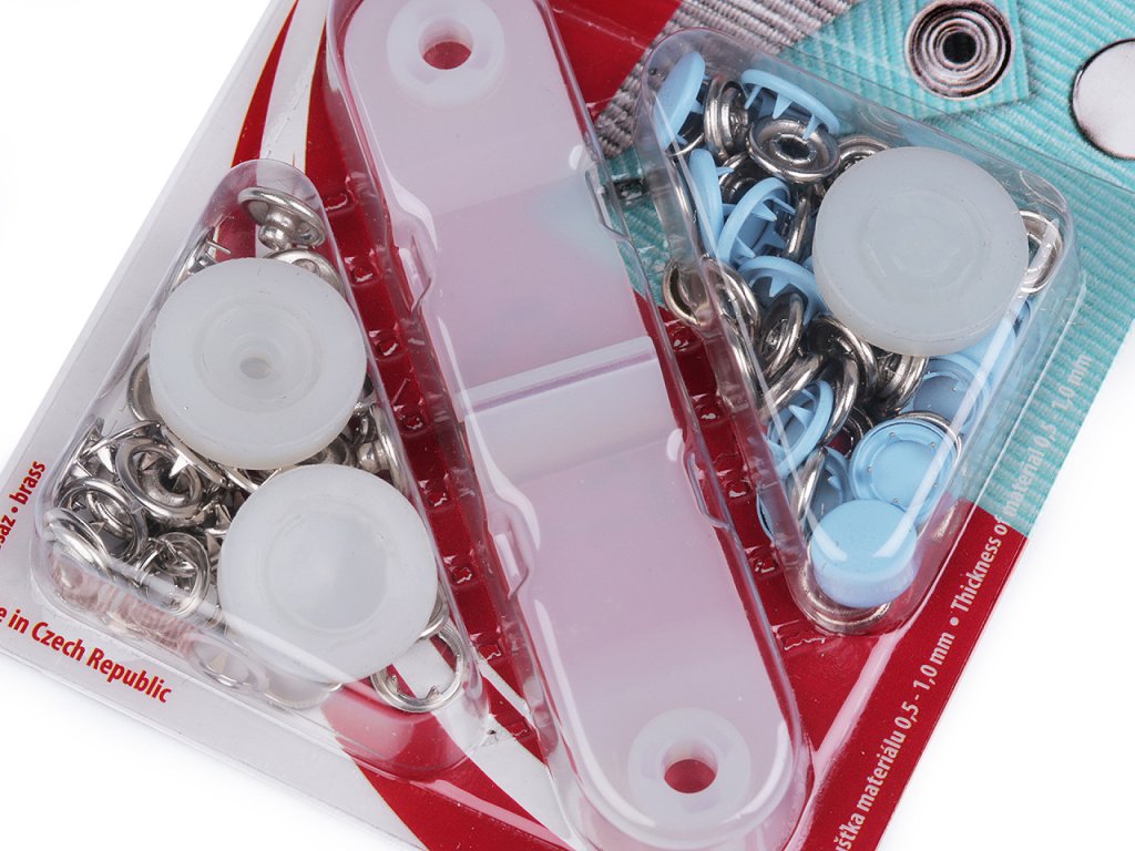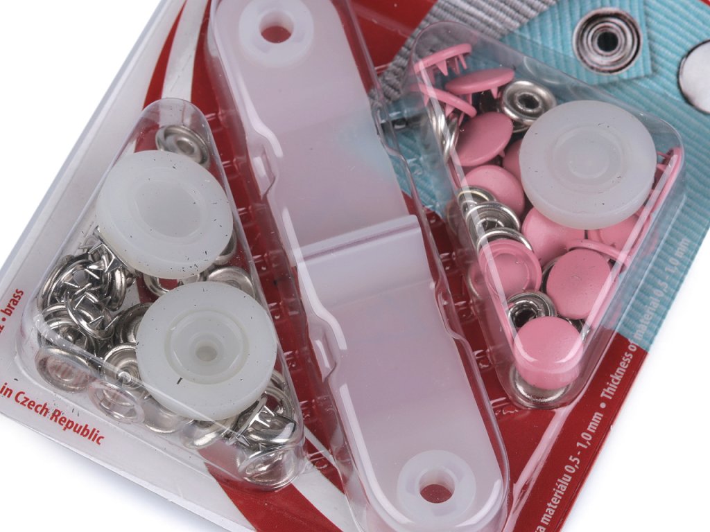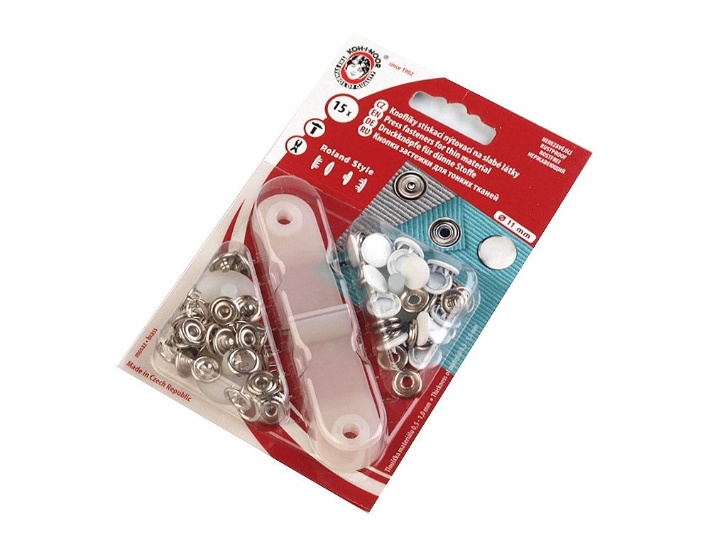 Stiskací knoflíky Roland style využijete ke spojování jemných a poddajných druhů látek - froté, úplet, košilovina aj. Nýtování se provádí mini lisem, který je součástí balení.- Průměr: 11 mm