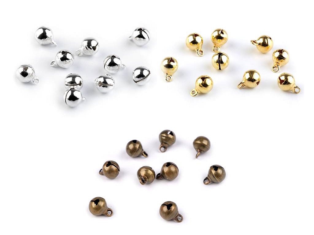 Drobné kovové rolničky standardní kvality, určeny pouze k dekoračním účelům - například na vánoční věnce. Zvoní tlumeněji. Průměr rolniček je cca 7,6 mm, může se mírně lišit. Průvlek jsou 2 mm. Celková velikost rolničky včetně očka je 11 mm.- Průměr: cca 8 mm